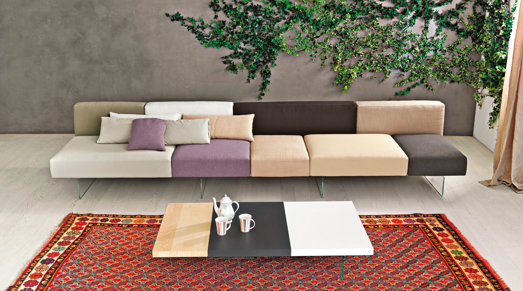 Air modular sofa from Italian manufacturer Lago. The frame is made of wood and glass. Upholstery - textiles. Filler - polyurethane foam. Air and soft furnishing system. The revolution in the concept of the sofa, which becomes modular and transformable. Backrest and seat cushion are fully interchangeable. Thus, the sofa can be changed according to your needs or mood. The model conducts a revolution in spatial, aesthetic and ergonomic.