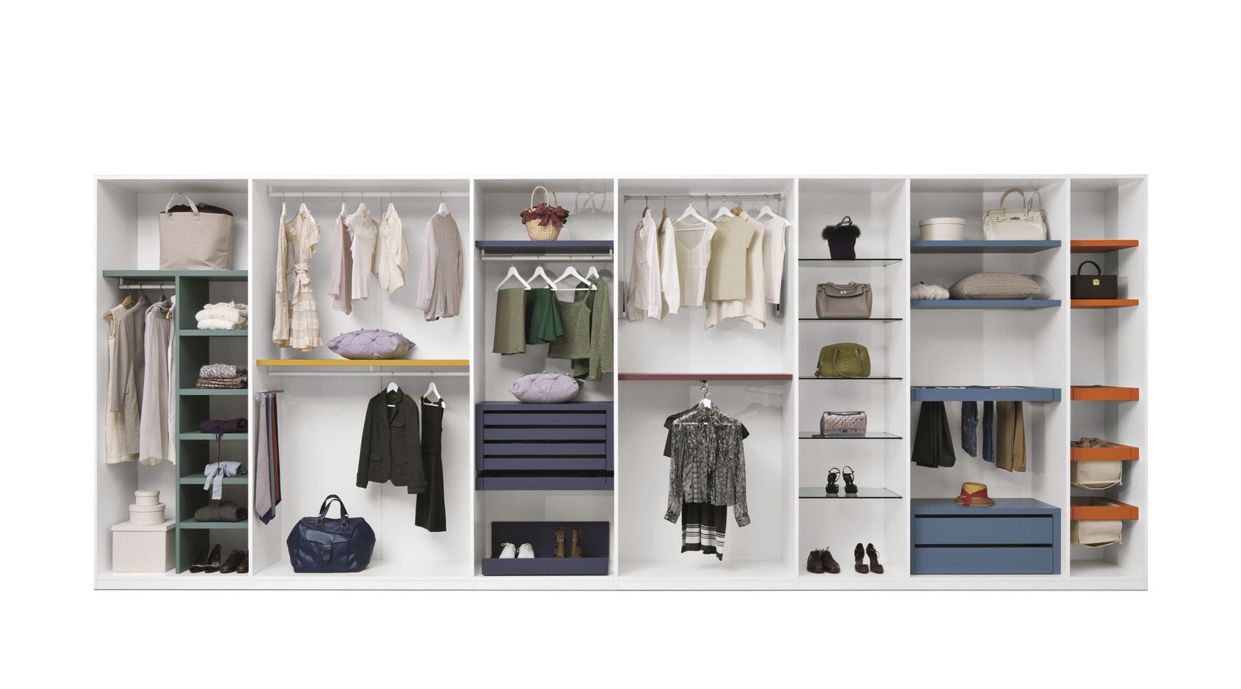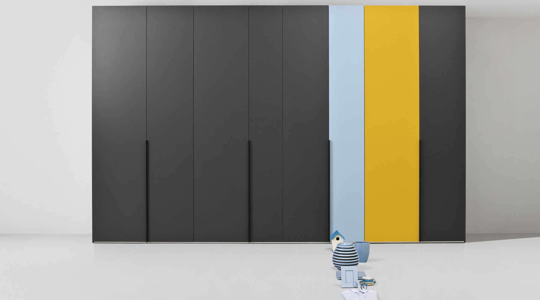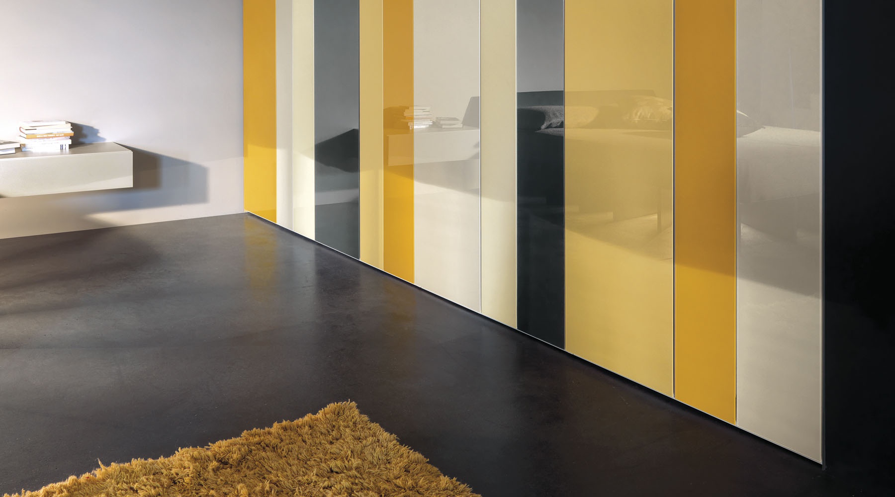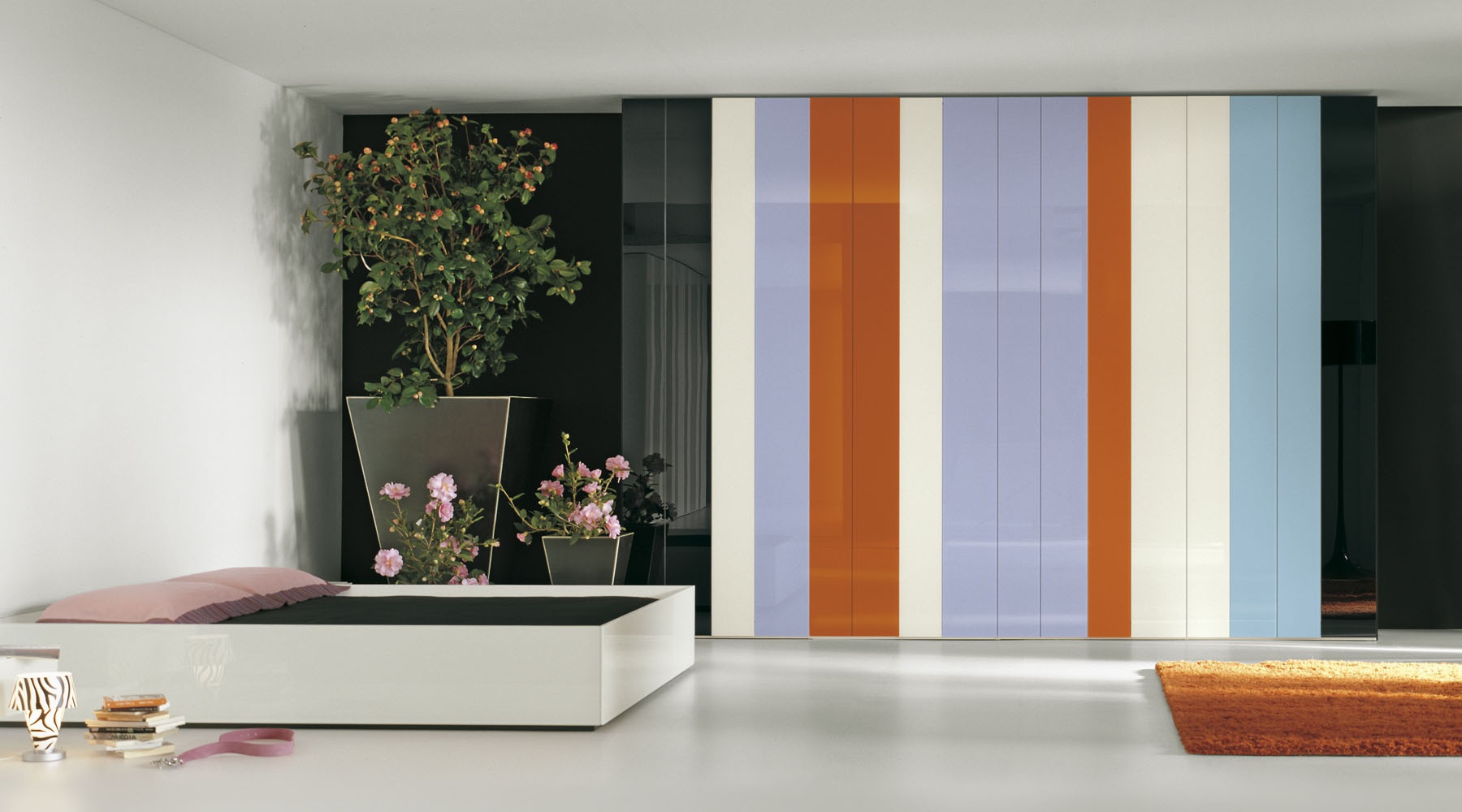 The N. O. W. wardrobe from Italian manufacturer Lago. Made of wood, glass, and metal. Various kinds of surface and material for production, with colored stripes, which allow the imagination to evoke emotions. It's colorful wardrobe, where traditional doors can be customized to size and color. Due to the absence of handles and custom parties to fit perfectly into the interior of the house. Glass panels can be installed on the rear of the enclosure. Thus can be used as a dividing wall or be installed in the center of the room.