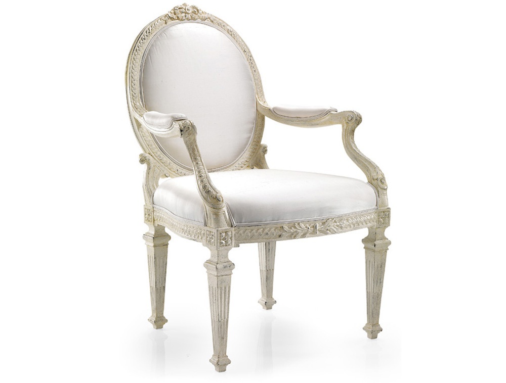 The chair from Italian producer Roberto Giovannini. The model with armrests provided on a frame of solid wood with oval back, finishing artificial ageing and patina. Legs and back are carved, handmade. As an upholstery manufacturer provides textiles or leather colours to choose from the assortment. Chair with armrests in a classic style that fit perfectly into the interior of your dining room or living room.