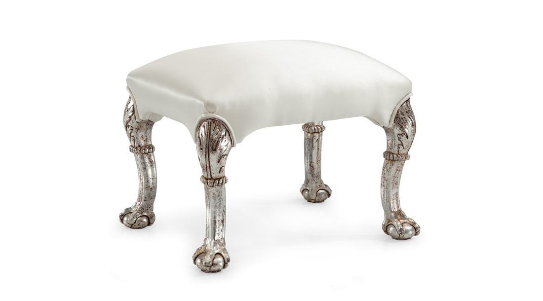 Pouf from Italian producer Roberto Giovaninni. The model is made on a carved base of solid, finish - antique silver filler polyurethane foam. Decorative elements in the form of balls and claw carving handmade. Colours in stock. For upholstery, use textile or leather. Stool will surely embellish your interior living room or hall in the classical style.
