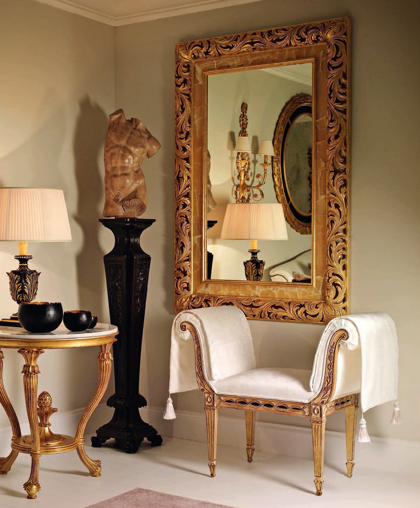 frame: natural wood upholstery: textiles upholstery: genuine leather finish: gilding finish: patina base: handmade |