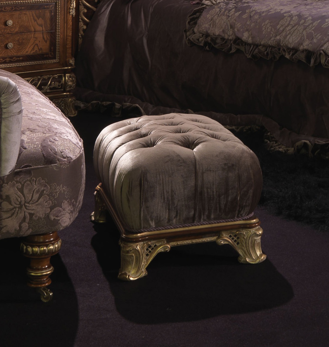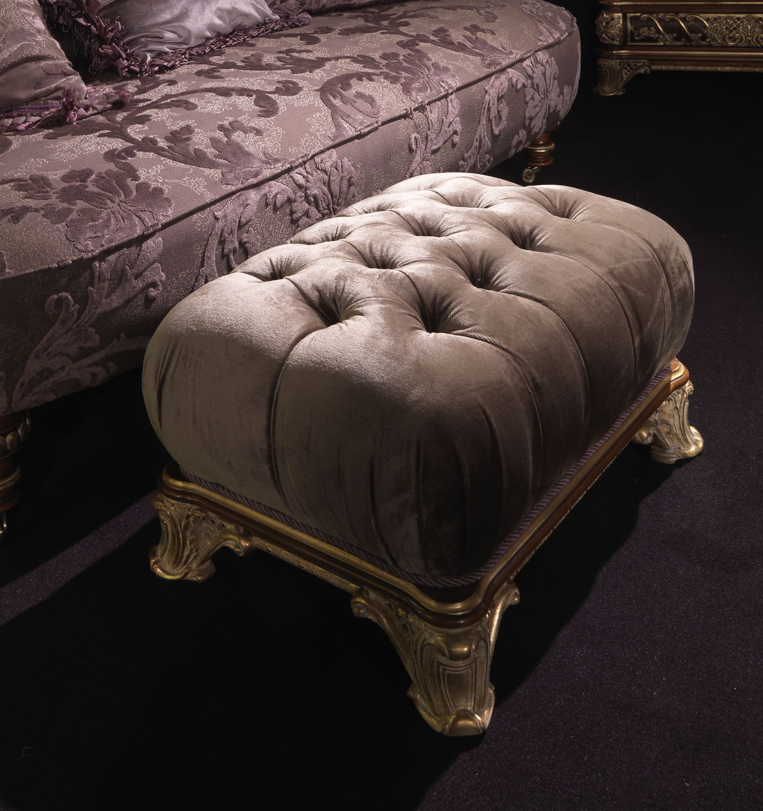 Poof Opera from the Italian manufacturer Jumbo Collection. The design is executed in classical style. Frame made of solid wood. For upholstery, satin or velvet. The upholstery is made of quilted material. Feet with elements of thread, finish under the gold.