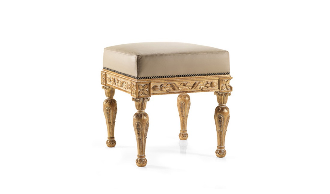 Pouf from Italian producer Roberto Giovaninni. The model in convex legs, frame in natural wood finish patina and gilding, the filler is polyurethane foam. The upholstery is available from textiles or leather, colors to choose from manufacturer's catalogue. Decorative elements - hand-carved. The pouf is made in a classic style, a great addition for your bedroom or hall. Combines tradition and design in the late eighteenth century.