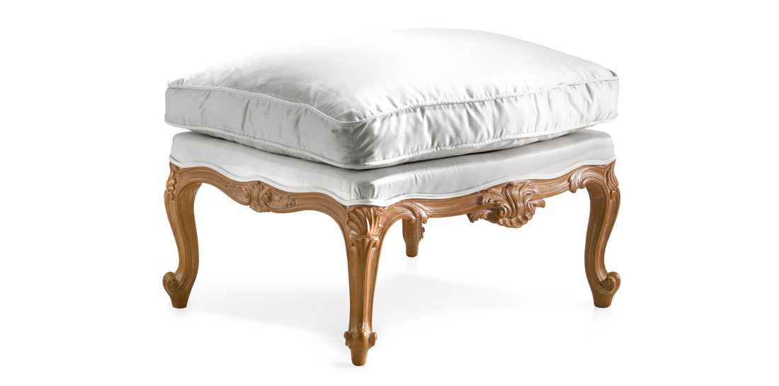 Pouf from Italian producer Roberto Giovaninni. The model is made on a carved base of solid bleached oak finish - patina. Decorative elements - hand-carved. The seat pouf is made in the form of cushions filled with polyurethane foam, upholstery fabric offered. Colours in stock. Stool will surely embellish your interior living room or hall in the classical style.