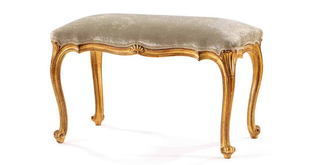Bench from Italian producer Roberto Giovannini. Presents a model on 4 curved legs, frame made of natural wood, artificial aging and gilding, the filler is polyurethane foam. The upholstery is available from textiles or leather, colors to choose from manufacturer's catalogue. Decorative elements - hand-carved. The model is made in classic style, a great addition for your bedroom or hall.
