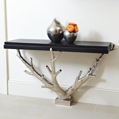 The console Branch from an American manufacturer Global Views made in the art Deco style. For example, this console designer demonstrates art illustration of a functional piece of furniture - it not only performs the function of a stand, a vase of flowers, etc., but also decorates the wall, defining the style of the entire room. Wooden countertop black color with a carved fluted top edge. The frame and legs are in the form of branches made of cast aluminum. Global Views when creating their collections of furniture and accessories uses both the experience of older European couture houses such as Chanel, Balenciaga and Hermes and fresh ideas of modern designers. Colorful, multi-layered collection are a refreshing blend of Antiques and the sense of modernity.