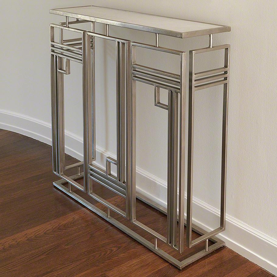 The Harrison console from an American manufacturer Global Views. Designer console, inspired by the architecture and skyscrapers designed in the art Deco style. It will look great in the dining room, the living room or the spacious lobby, easy to fit into the modern interior and fill it with air. The console complex geometric shapes made of wrought silver, table top honed, white marble. Global Views when creating their collections of furniture and accessories uses both the experience of older European couture houses such as Chanel, Balenciaga and Hermes and fresh ideas of modern designers. Colorful, multi-layered collection are a refreshing blend of Antiques and the sense of modernity.