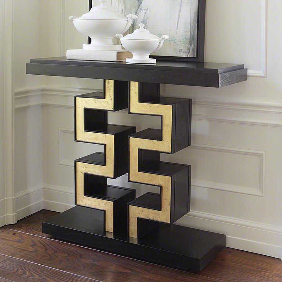 The console Race Track from an American manufacturer Global Views. Bold design console, made in art Deco style, perfectly fit into the interior of the dining room, the living room or the hallway. It looks equally good and the wall and freely in the space, localizing in the interior of a black stain with gold lacquer. Elegant console geometrical forms made of wood hardwood and is available in two finishes: black American walnut veneer and brown gold lacquer and walnut veneer and lacquered ivory. Global Views when creating their collections of furniture and accessories uses both the experience of older European couture houses such as Chanel, Balenciaga and Hermes and fresh ideas of modern designers. Colorful, multi-layered collection are a refreshing blend of Antiques and the sense of modernity.