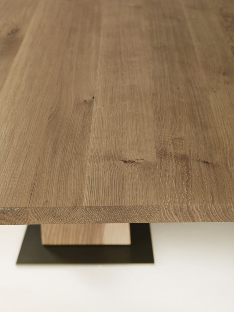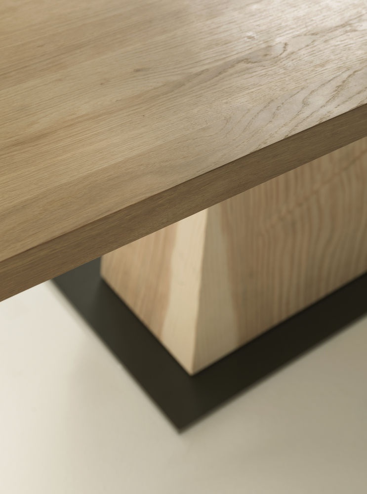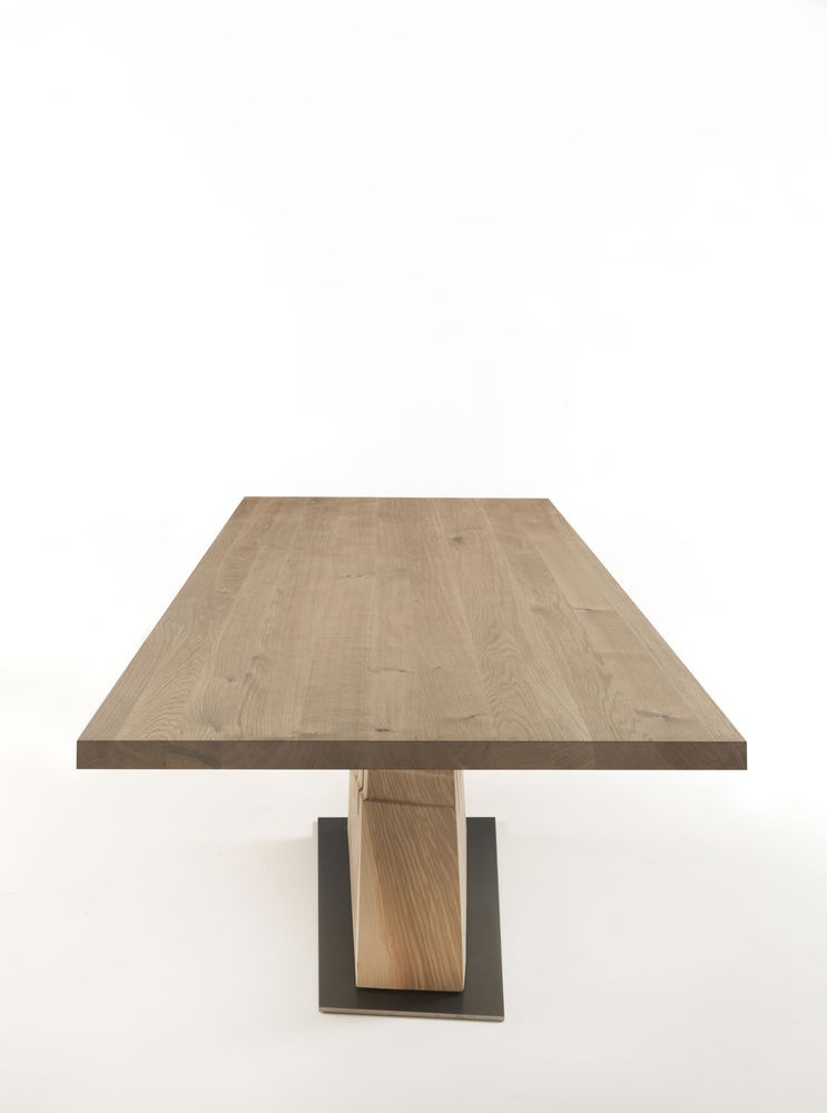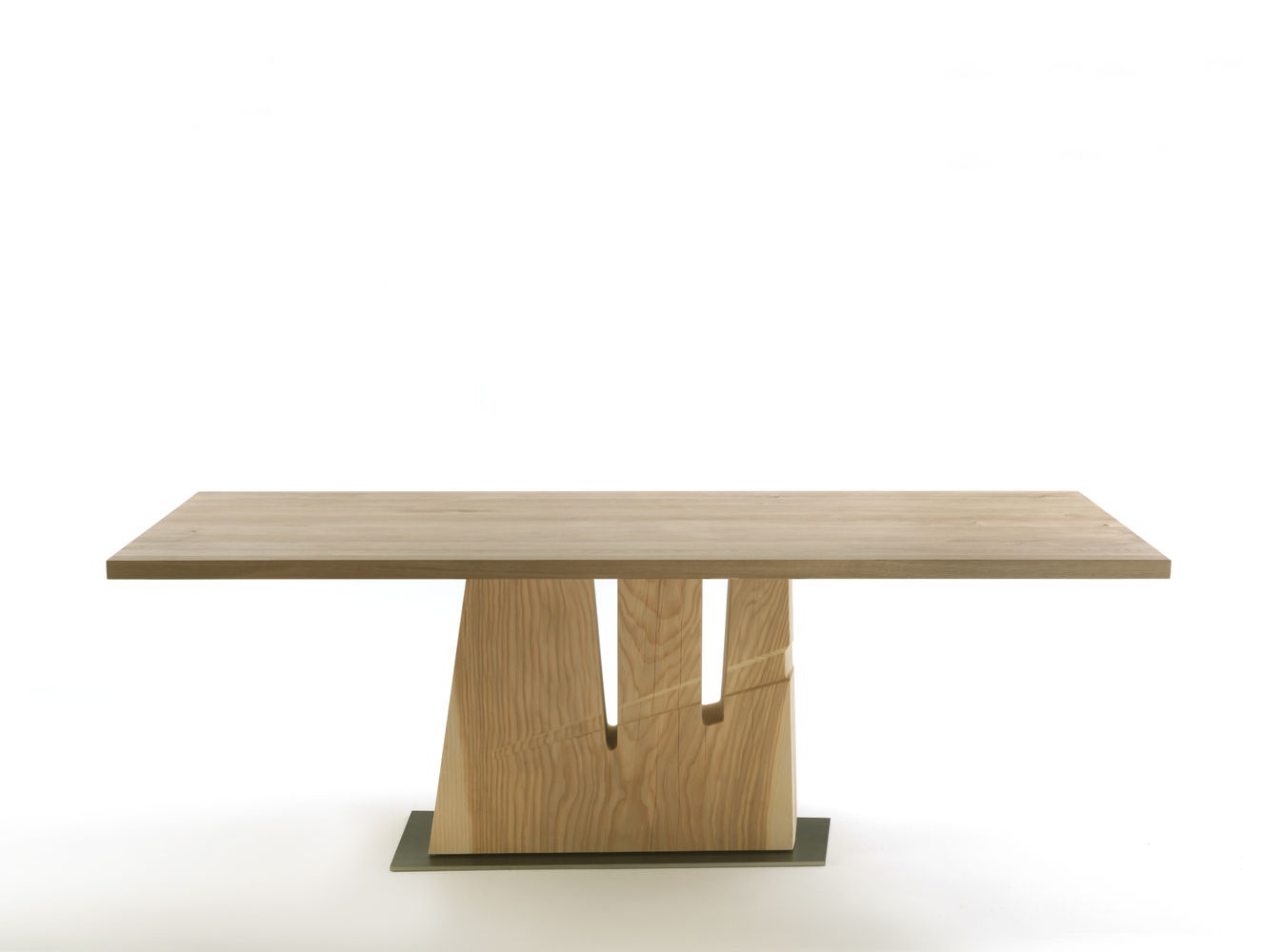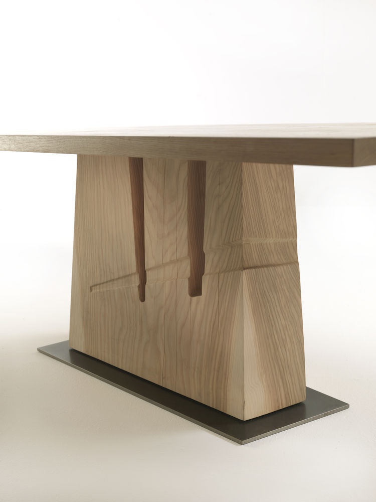 The Hache table from the Italian manufacturer Riva 1920. Model dining with rectangular table top. The table is completely made of solid wood of various species in the catalog of the company. The base is made from metal with finishes in the catalog of the company.