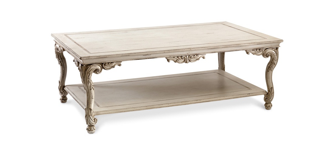Coffee table from Italian producer Roberto Giovaninni. Rectangular table top shape, base on curved legs made of solid wood, artificial ageing and patina. Decorative elements - hand-carved. There is a wood bottom shelf. Colors to be selected from the range of the factory. Table surely will beautify Your living room interior in classic style.