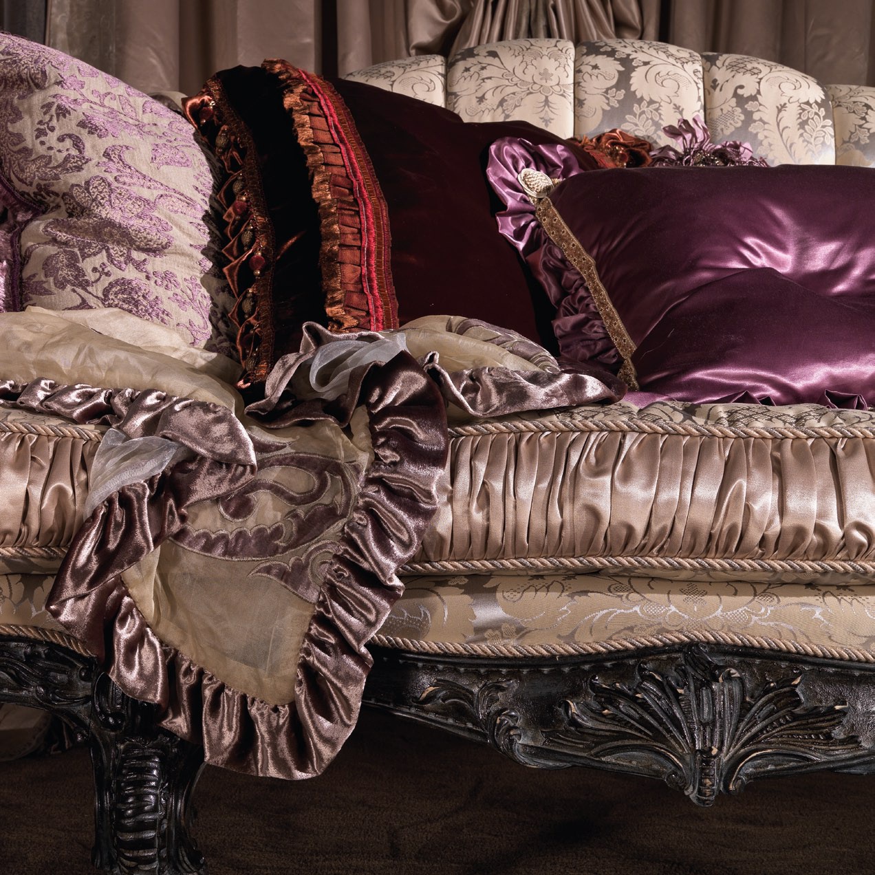 Three seater sofa from the collection of Manet from the Italian manufacturer Jumbo Collection. The original model in the Baroque style. Frame made of natural wood of hard sorts (Lipa). Decorative elements are carved, handmade. Varnishing is made with antique wax. Upholstery - textiles. Colours in stock.