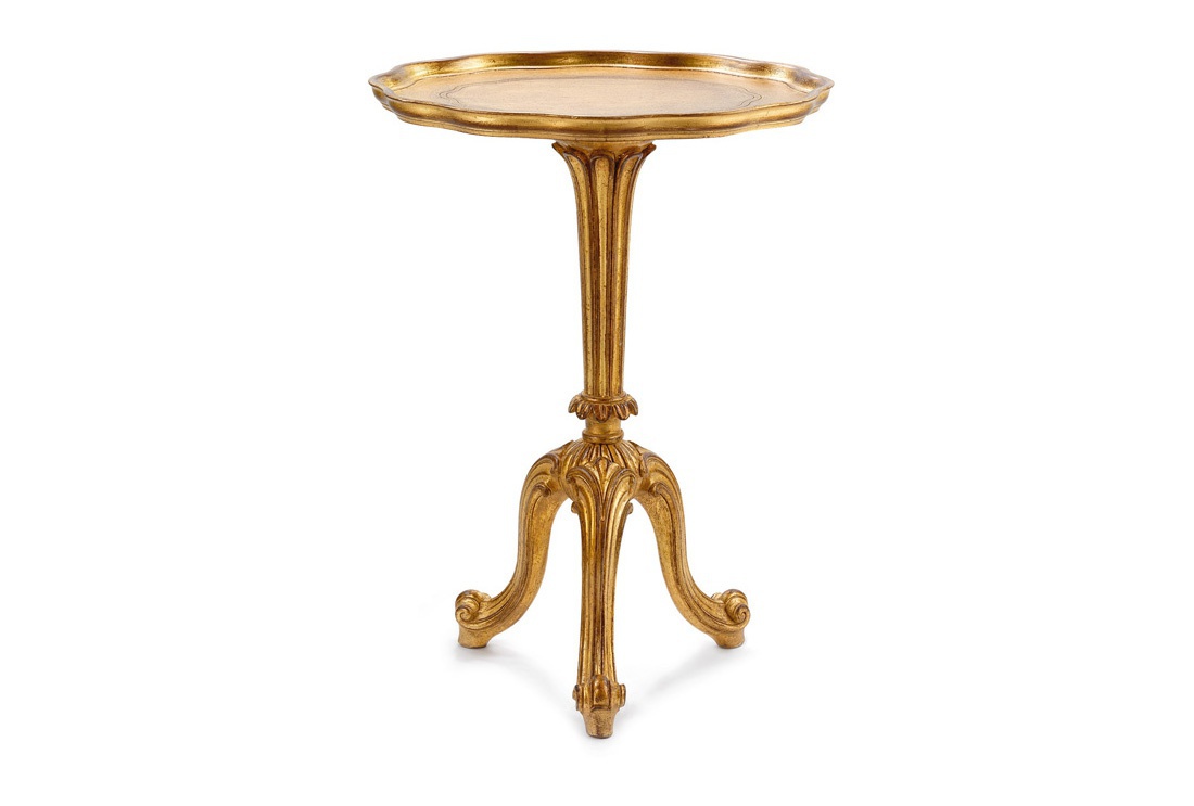 Coffee table from Italian producer Roberto Giovaninni. Presents a model of the round table on three curved legs, with a table top in the form of a tray made of natural wood. Finishing gilding and artificial aging. Decorative elements of handwork. Colours in stock. The model will perfectly complement the classic interior of the living room.