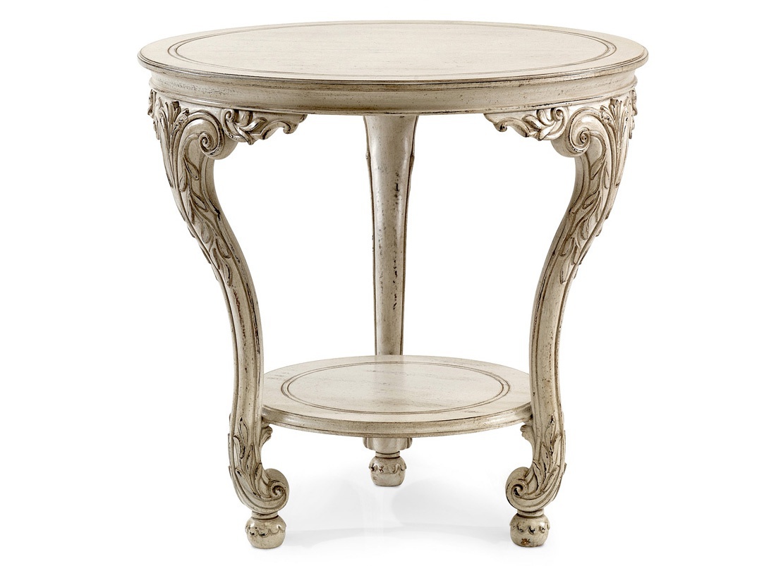 Coffee table from Italian producer Roberto Giovaninni. Presents a model of the round table. Base on three curved legs made from solid natural wood. The finish patina or artificial aging. Decorative elements - hand-carved. Colours in stock. The model will perfectly complement the classic interior of the living room or bedroom, as a bedside table.