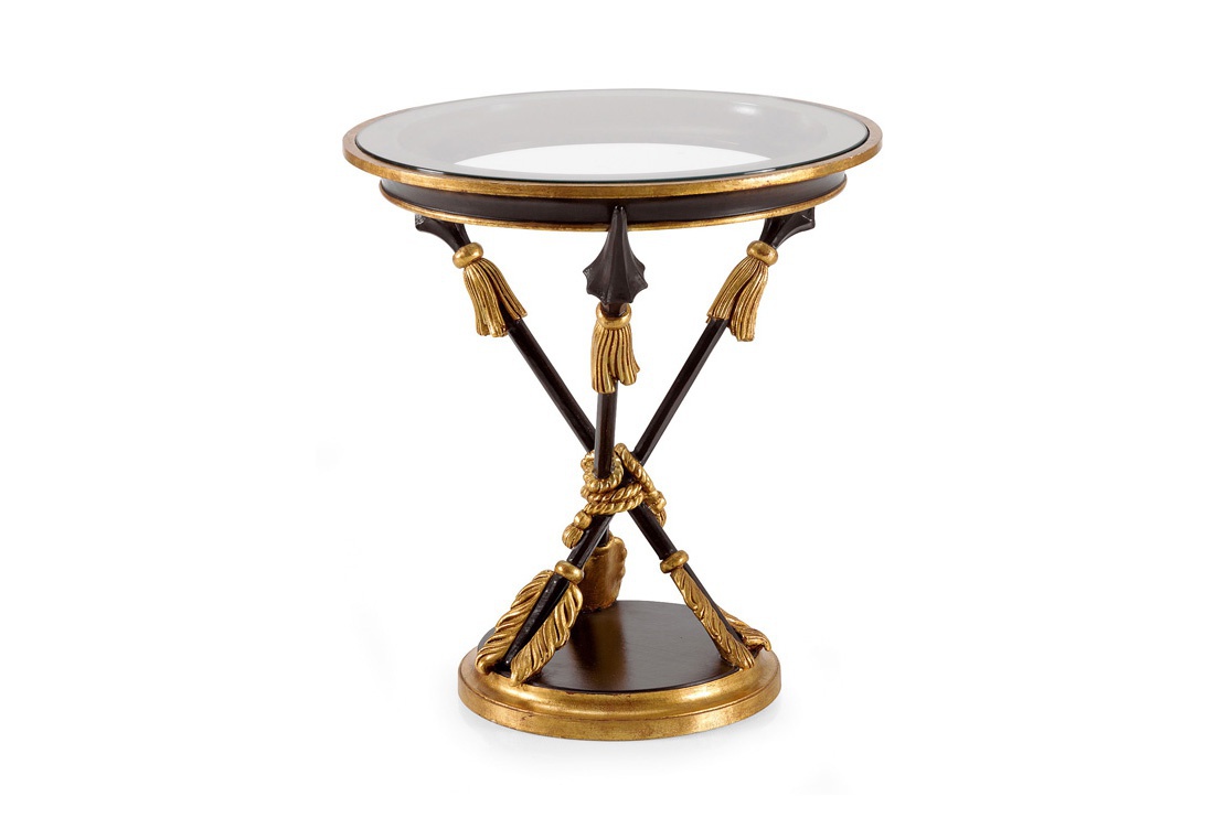 Coffee table from Italian producer Roberto Giovaninni. Presents a model of round table with glass top. The base is made in three arrows from natural wood. Finishing gilding and artificial aging. Decorative elements - hand-carved. Colours in stock. The model will perfectly complement the classic interior of the living room.