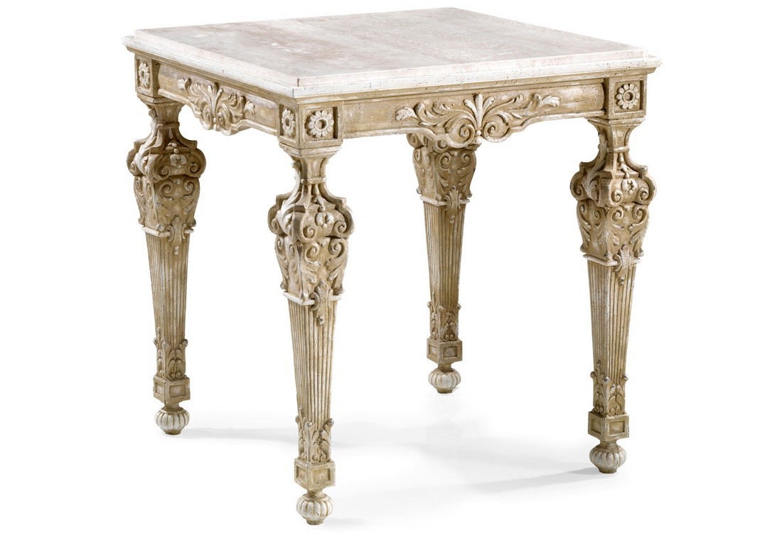 Coffee table from Italian producer Roberto Giovaninni. The base of the table is made of solid wood, decorated with handmade carving. The finish patina or artificial aging. Table top, square shape marble. Colors to choose from the range of the manufacturer. The model will perfectly complement the classic interior of the living room.