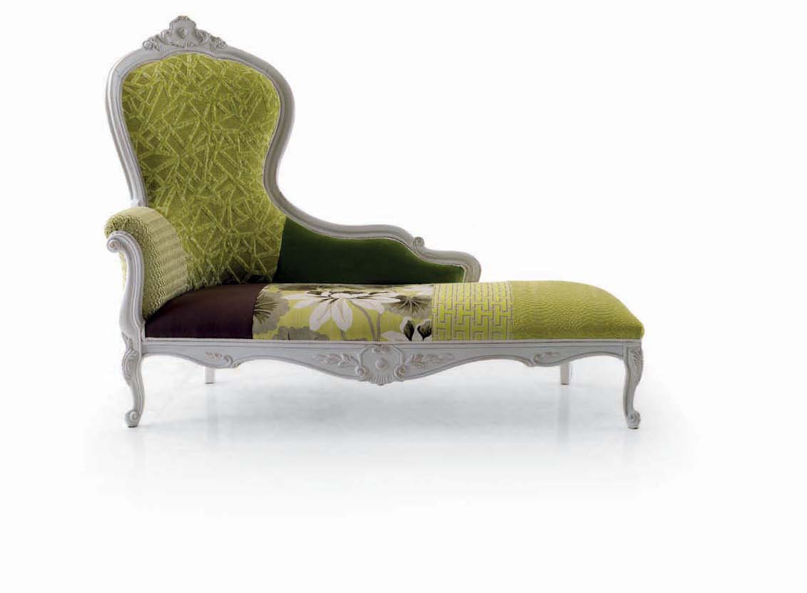 Chaise longue with a high back and armrests from the Italian manufacturer. The furniture is made of solid beech, the frame is decorated with a manual carving. Upholstery design, is a combination of fabrics of different structures and densities. Color green, possible variations in the catalog of the manufacturer. The love seat will fit harmoniously into a modern glamorous interior.