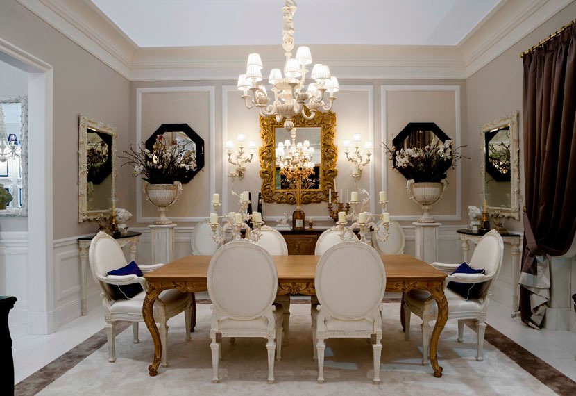 Dining table from Italian producer Roberto Giovaninni. Presents a model of table of rectangular form, gilt finish. The frame is made from solid wood. The base and legs are decorated with hand-carved. Table top made of solid bleached oak. The model is made in classic style, combines tradition and design. Colours in stock. The perfect solution for the interior of Your dining room.