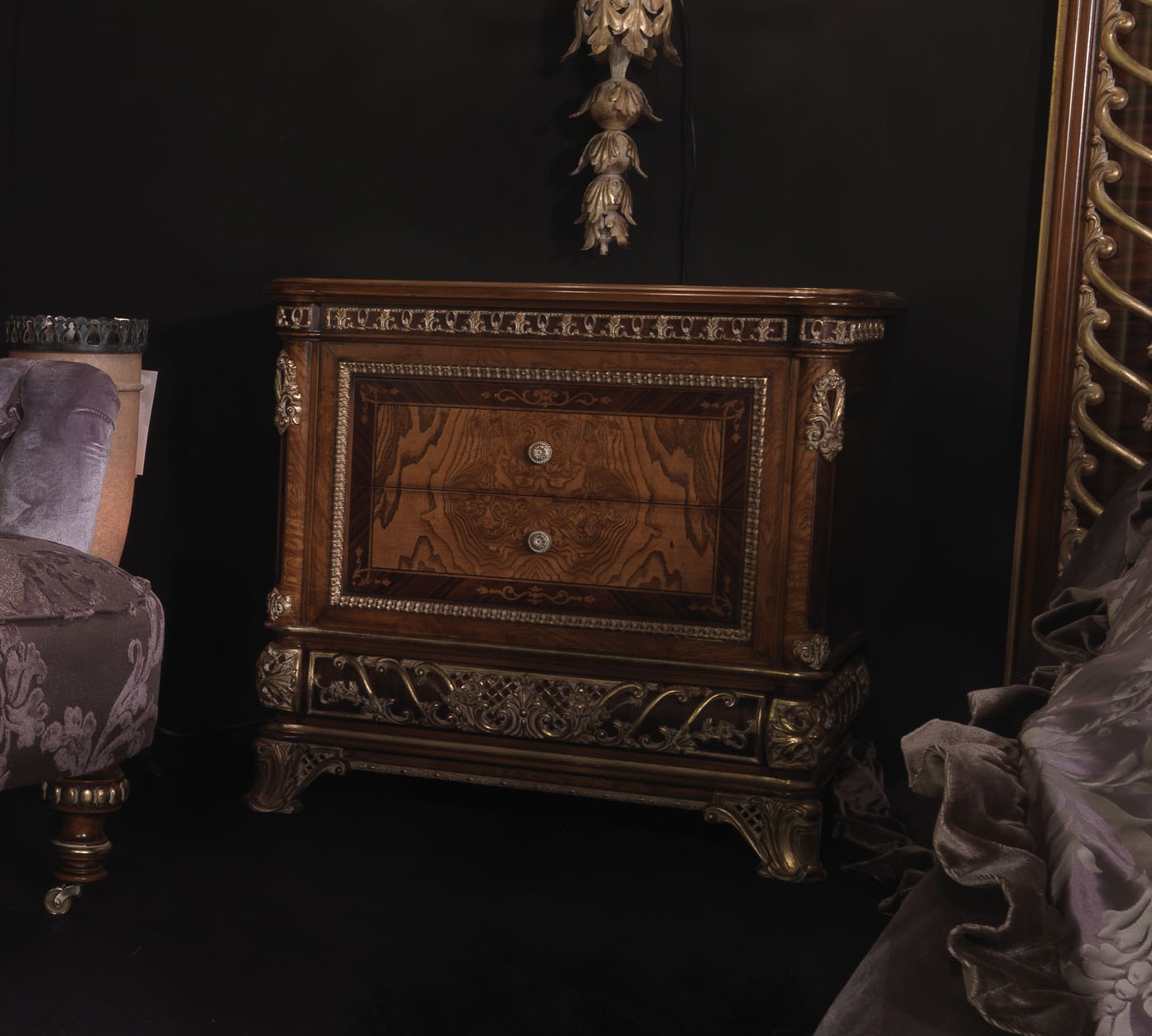 OPE bedside table from the Italian manufacturer Jumbo Collection. The design is executed in classical style. The solid wood. Bedside table with fretted elements, the surface is aged, the finish under the gold. The facade with elements of marquetry.
