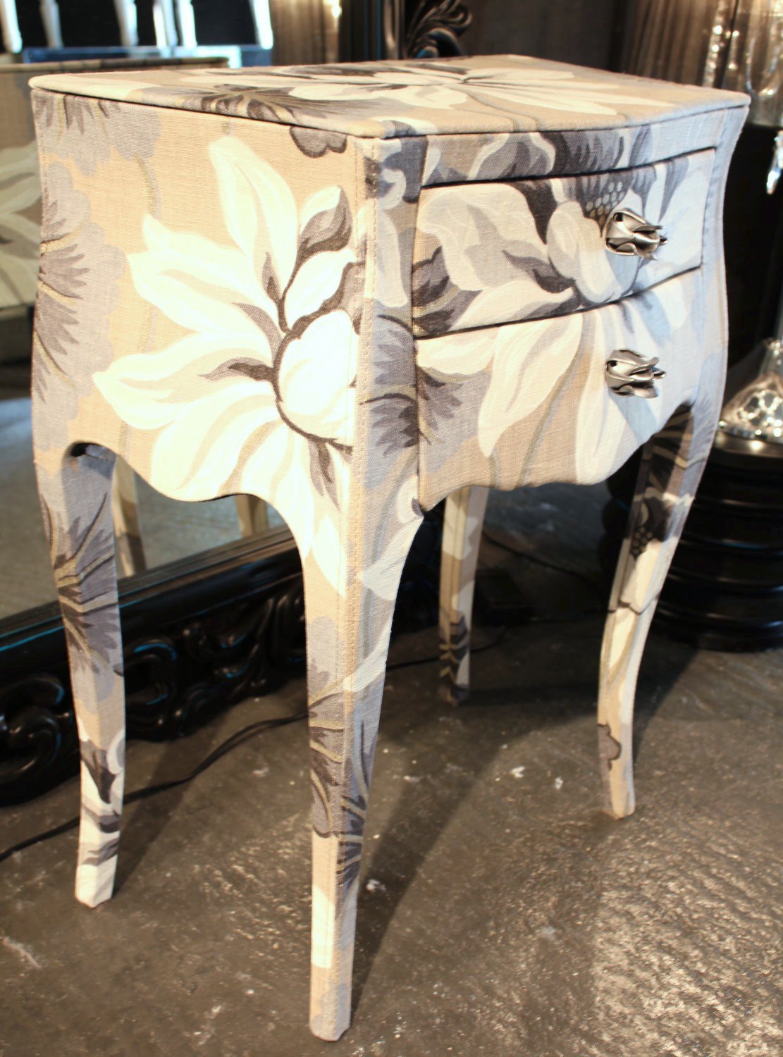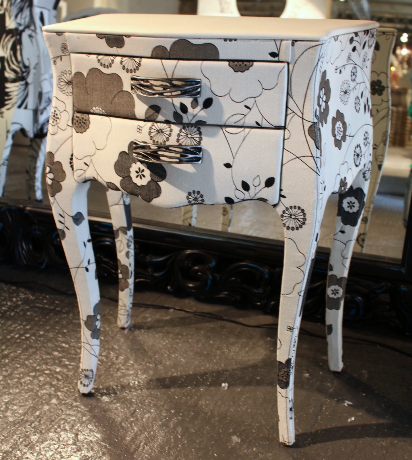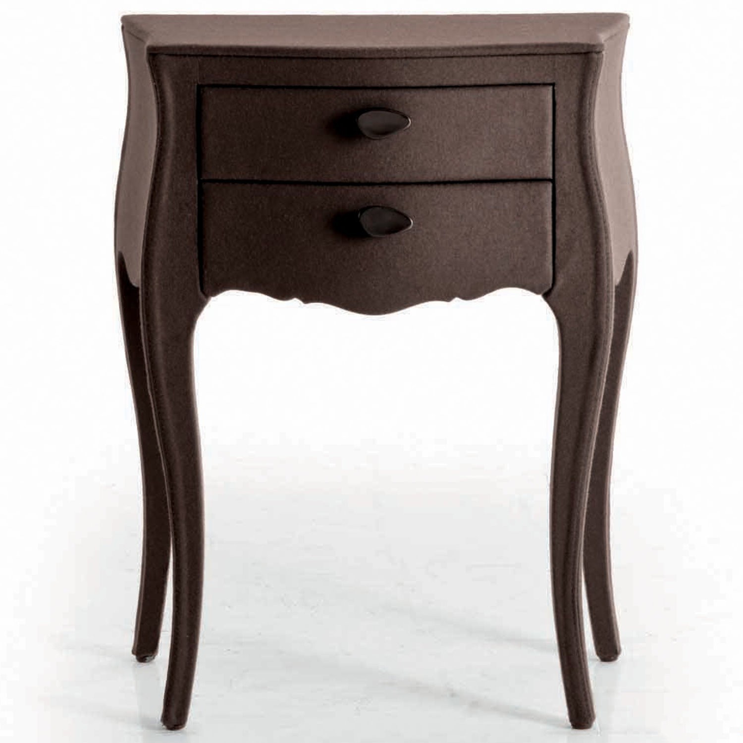 Table 2 Concept from the Italian manufacturer Moda. Materials used: body - solid wood, fittings - brass. Body is fully upholstered with textile, available on the manufacturer's catalogue, the model presents in wool fabric. The nightstand has two drawers for storage. Color: black and white, blue variety. Body with convex sides and legs - Cabriole. Style - glamour.