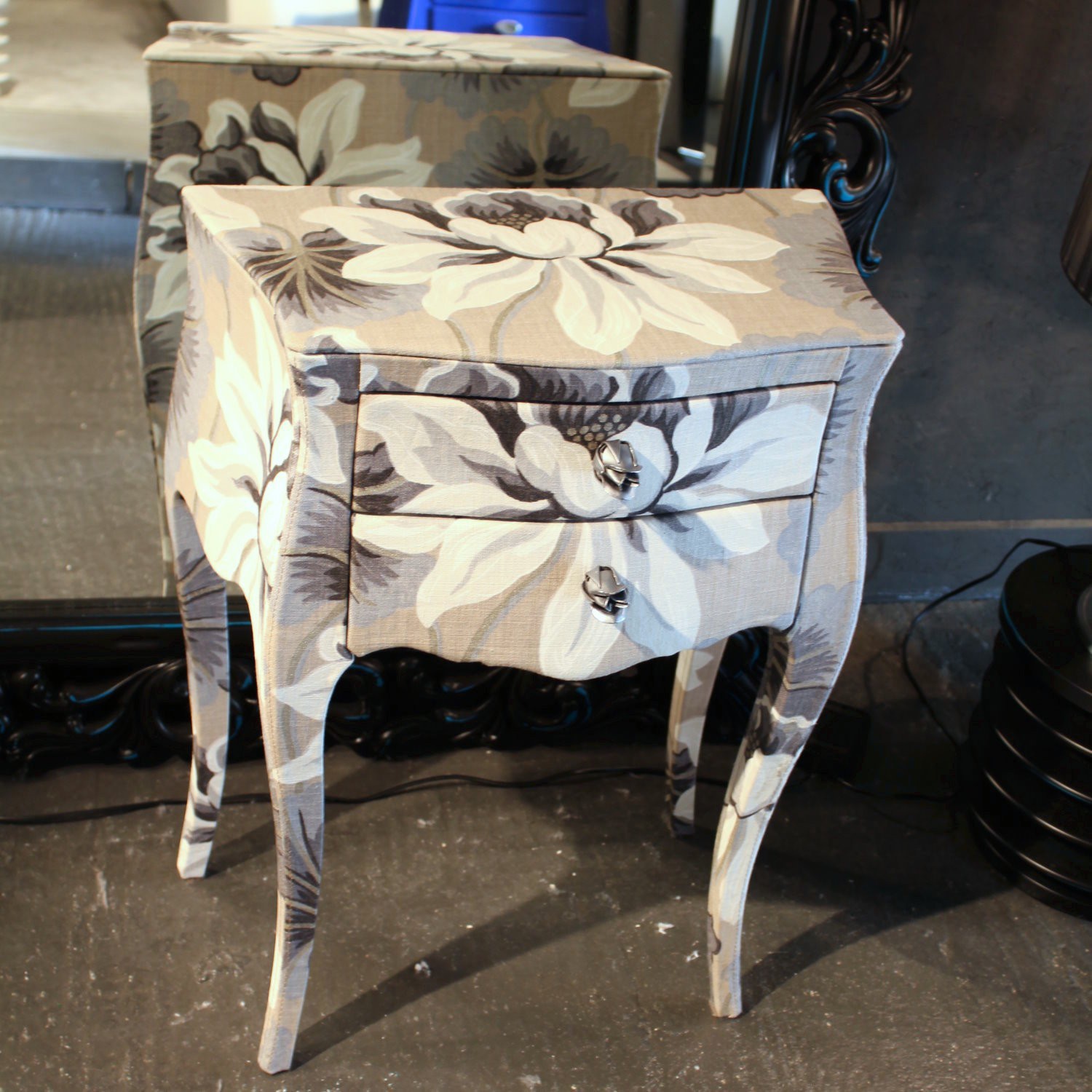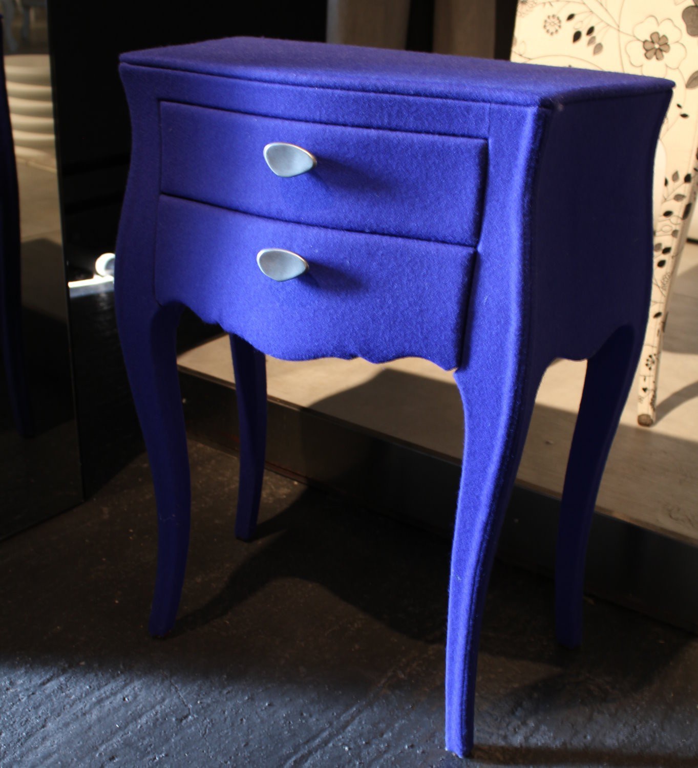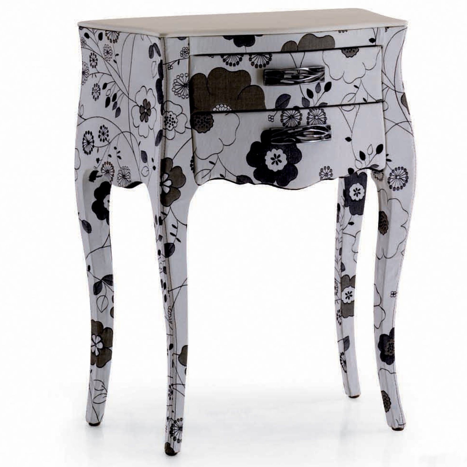 Table 2 Concept from the Italian manufacturer Moda. Materials used: body - solid wood, fittings - brass. Body is fully upholstered with textile, available on the manufacturer's catalogue, the model presents in wool fabric. The nightstand has two drawers for storage. Color: black and white, blue variety. Body with convex sides and legs - Cabriole. Style - glamour.