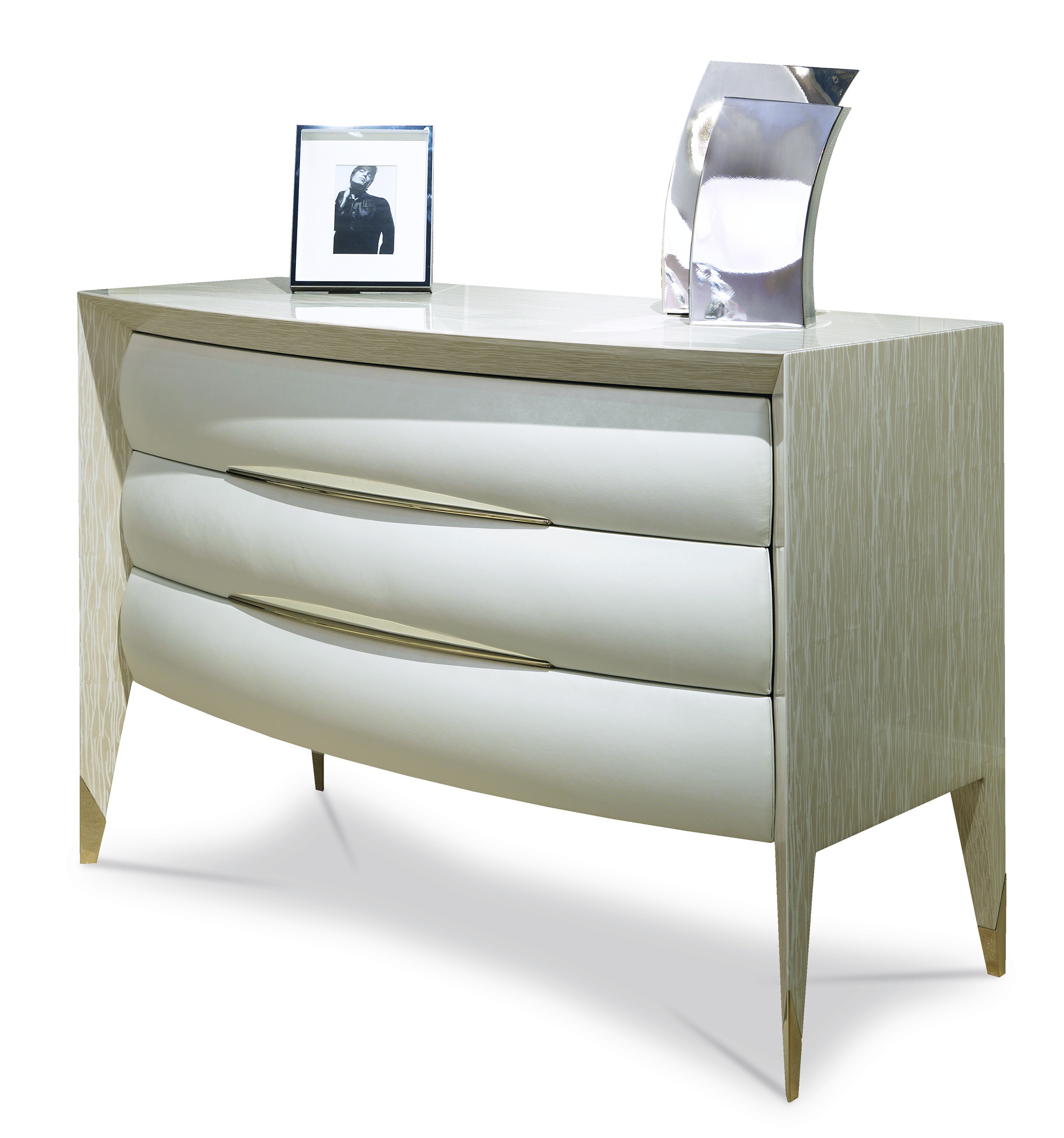 The Orion chest of drawers from Italian manufacturer Turri. Frame, legs made of wood. The surface is lacquered from a range of companies. The facade of the drawers are decorated with natural leather. The accessories and the tripod is made of metal bronze. Colors from manufacturer's catalogue. Model in designer style. The perfect choice for a modern elegant interior.