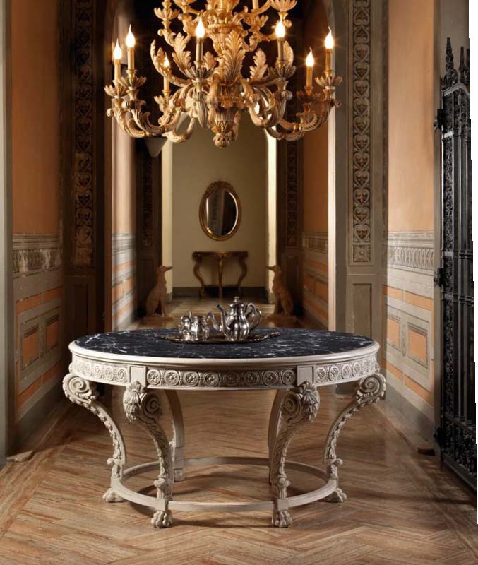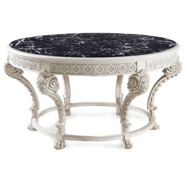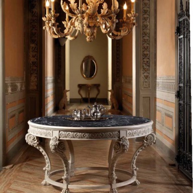 Dining table from Italian producer Roberto Giovaninni. Presents a model of the round table on the basis of solid wood, the finish is patina. Decorative elements - hand-carved. The surface is varnished in white. The table top is made of marble. Colors to choose from manufacturer's catalogue. The model is made in classic style, combines tradition and design.