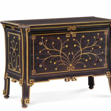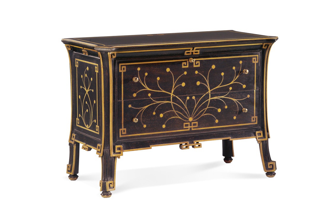 A chest of drawers from the Italian producer Roberto Giovaninni. The model is made from solid natural wood, lacquered black finish and gold patina. Decorative elements in the form of straight geometric lines - hand carved. The model with two drawers on high legs. Colours in stock. Commode with Japanese motifs perfectly complement the interior of your bedroom or living room.