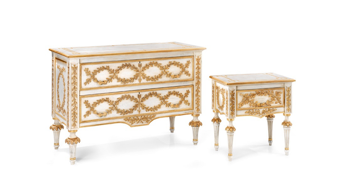 A chest of drawers from the Italian producer Roberto Giovaninni. The frame is made from solid wood. Finishing gilding and artificial aging. Decorative elements in the form of bound Laurel leaves - hand carved. The model with two drawers on high legs in classic style. Colours in stock. The chest will perfectly complement the classic interior of your bedroom, combines tradition and design of the late eighteenth century, Neoclassicism.