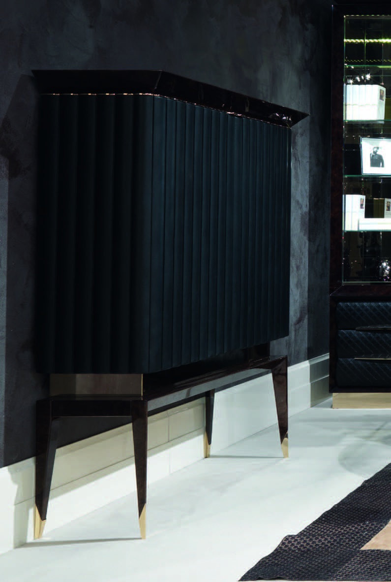 The Orion Cabinet from the Italian manufacturer Turri. The frame is made from wood. Surface finish - glossy lacquer from a range of companies. The d?cor consists of natural leather, metal. The highlight of this model - the corrugated surface of the facade. Colors - in stock. Product design. A great choice for the office. The Cabinet included in Cabinet set collection Orion.