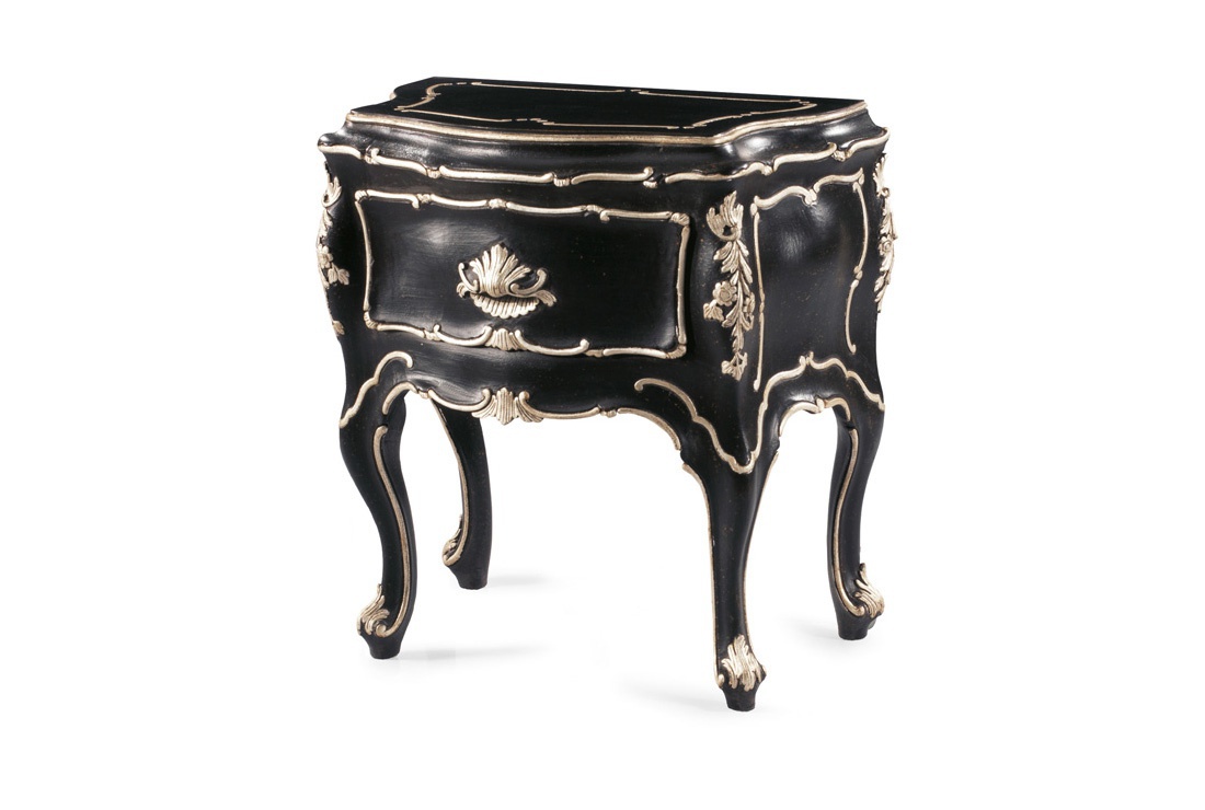Bedside Cabinet from the Italian producer Roberto Giovaninni. The model is made from natural wood. Finish - ebony wood and silver. Decorative elements - hand-carved. The model with a single drawer on high curved legs. Colours in stock. Bedside table will surely complement the classic interior of your bedroom, combines design and tradition of the XVIII century.