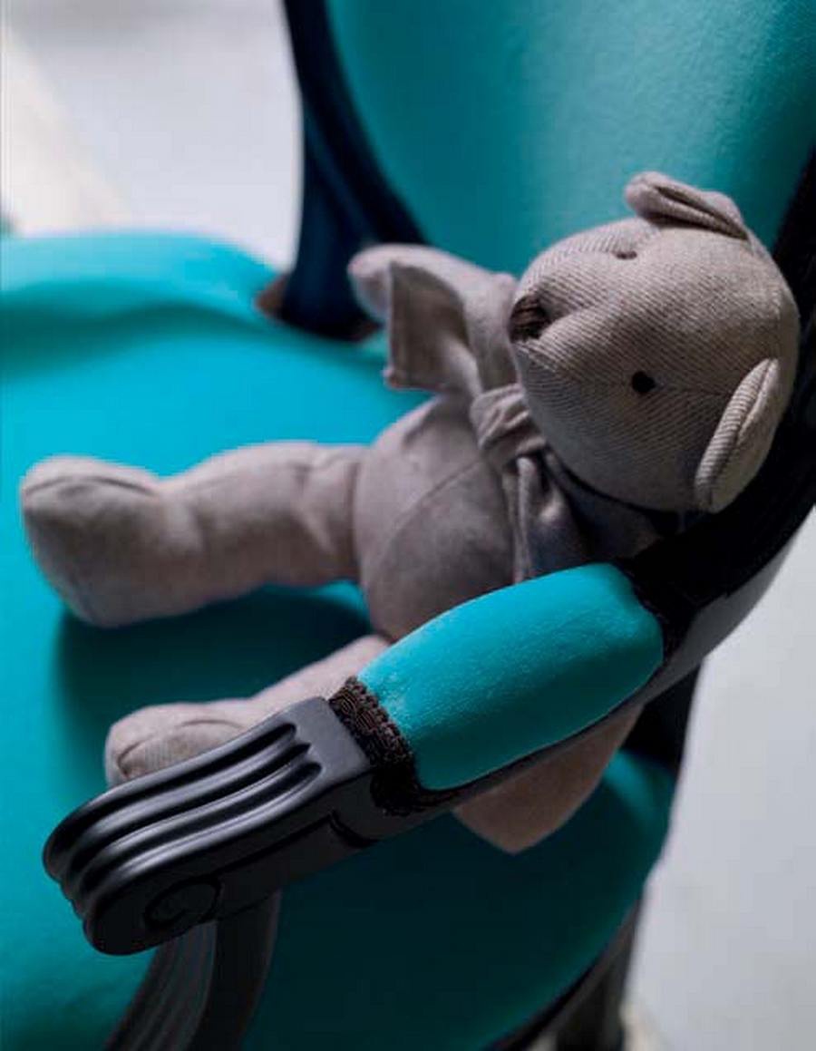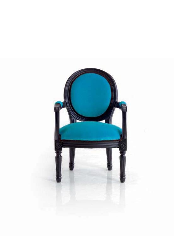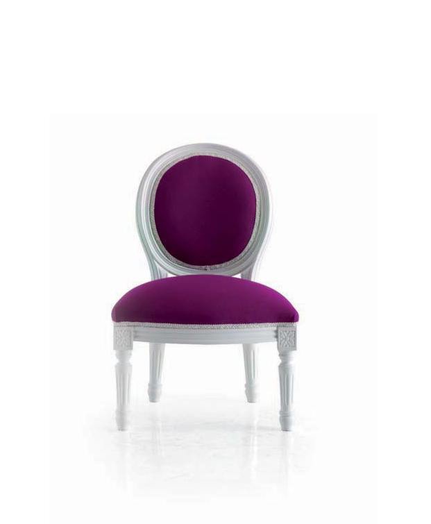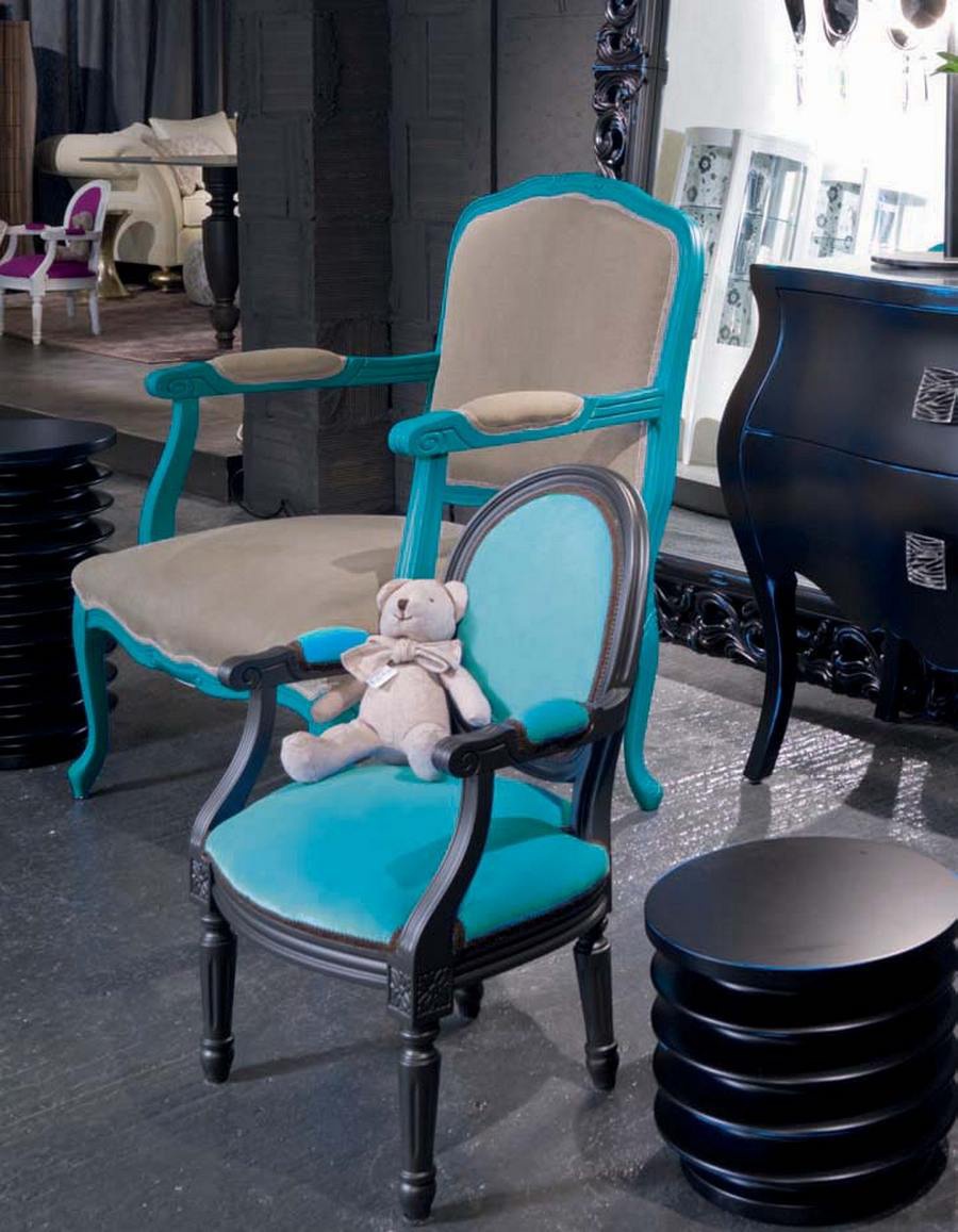 Remix Baby chair/S/B from the Italian manufacturer Moda. Furniture on a wooden frame with fabric upholstery. Presents a model with or without armrests. Color catalog of the manufacturer, the model presented in turquoise, purple. Style glamour, fits perfectly in the nursery in modern style.