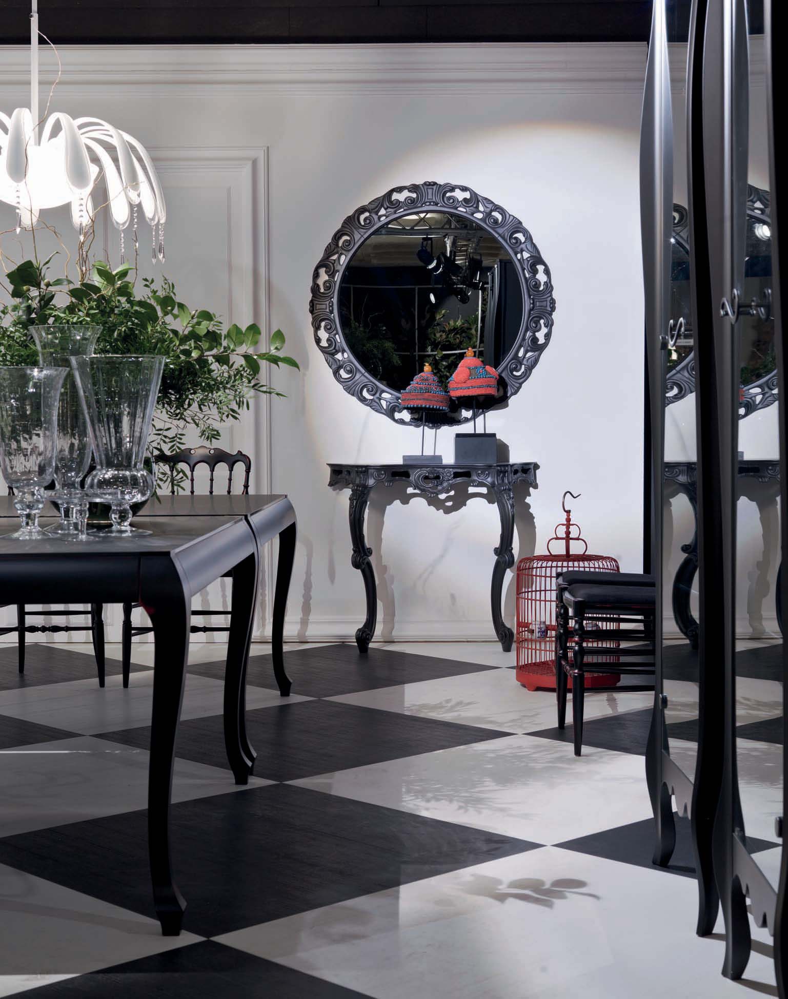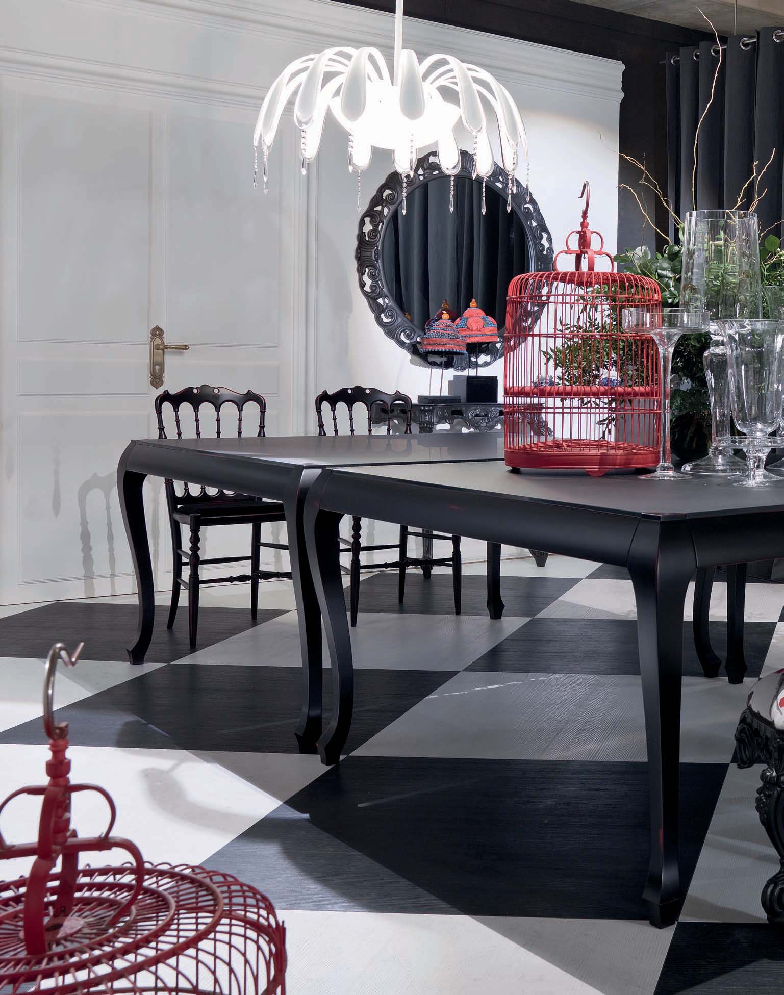 Table New York from the Italian manufacturer Moda. Furniture made of solid beech wood, table top made of tempered glass. Style furniture glamour. The colors in the catalog of the manufacturer submitted a model in black and red and turquoise. Strength materials ensure durability and usability for years to come.