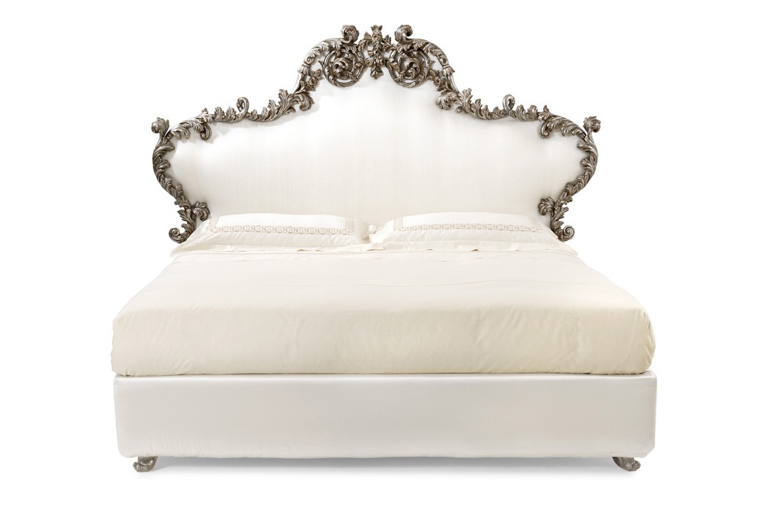 Double bed from Italian producer Roberto Giovaninni. Upholstered headboard is covered in white satin and decorated with hand carved, finished with patina and silver. Colors to choose from the range of the manufacturer. The frame is made from solid wood to fabric. Curved legs made of wood. A perfect model for bedroom in classical style.