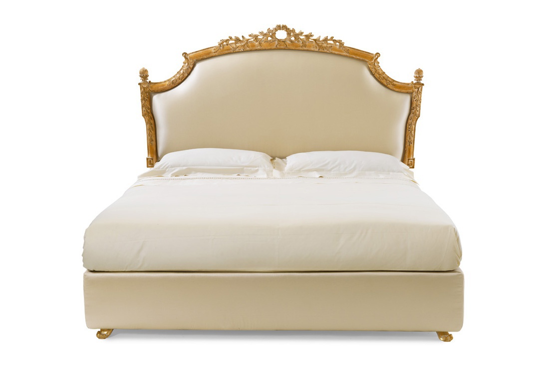 Double bed from Italian producer Roberto Giovaninni. Soft headboard covered with fabrics and adorned with hand-carved in the form of a wreath of flowers, finished with patina and gilding. Colors to choose from the range of the manufacturer. The frame is made from solid wood to fabric. Curved legs made of wood. The bed will decorate the interior of your bedroom in classic style.