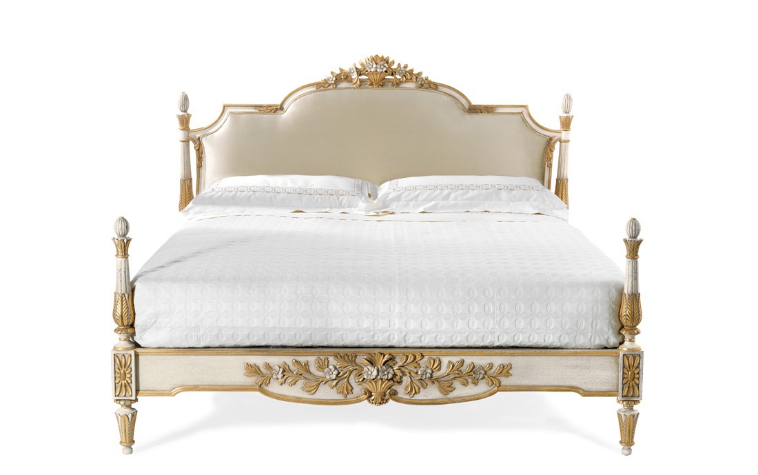 Double bed from Italian producer Roberto Giovaninni. Headboard upholstered, covered with textile, decorated with hand-carved in the form of a bouquet of flowers, finished with patina and gilding. Colors to choose from the range of the manufacturer. The frame is made from solid wood. The base with legs in natural wood. Headboard and footboard are decorated with carved columns. A perfect model for bedroom in classical style.