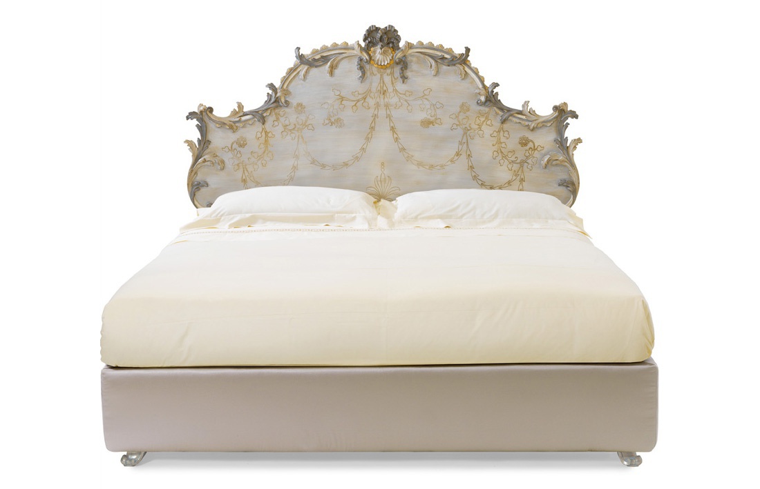 Double bed from Italian producer Roberto Giovaninni. Presents a model with wooden headboard decorated with engraved garlands of flowers and decorated with hand-carved finish - patina. Colors to choose from the range of the manufacturer. The frame is made from solid wood to fabric. Base on curved legs made of wood. A perfect model for bedroom in classical style or Provence.