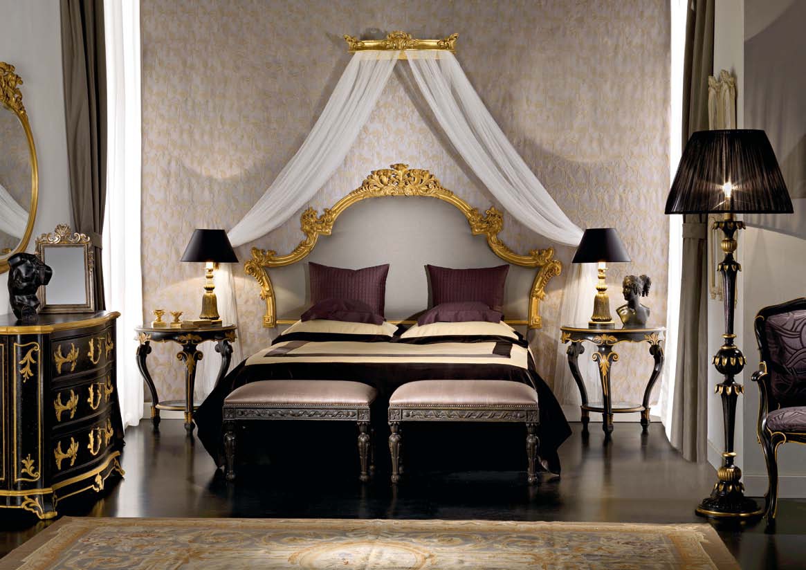Double bed from Italian producer Roberto Giovaninni. Upholstered headboard is covered in satin and decorated with hand carved, finished with patina and gilding. Colors to choose from the range of the manufacturer. The frame is made from solid wood. Base on curved legs made of wood. A perfect model for bedroom in classical style.