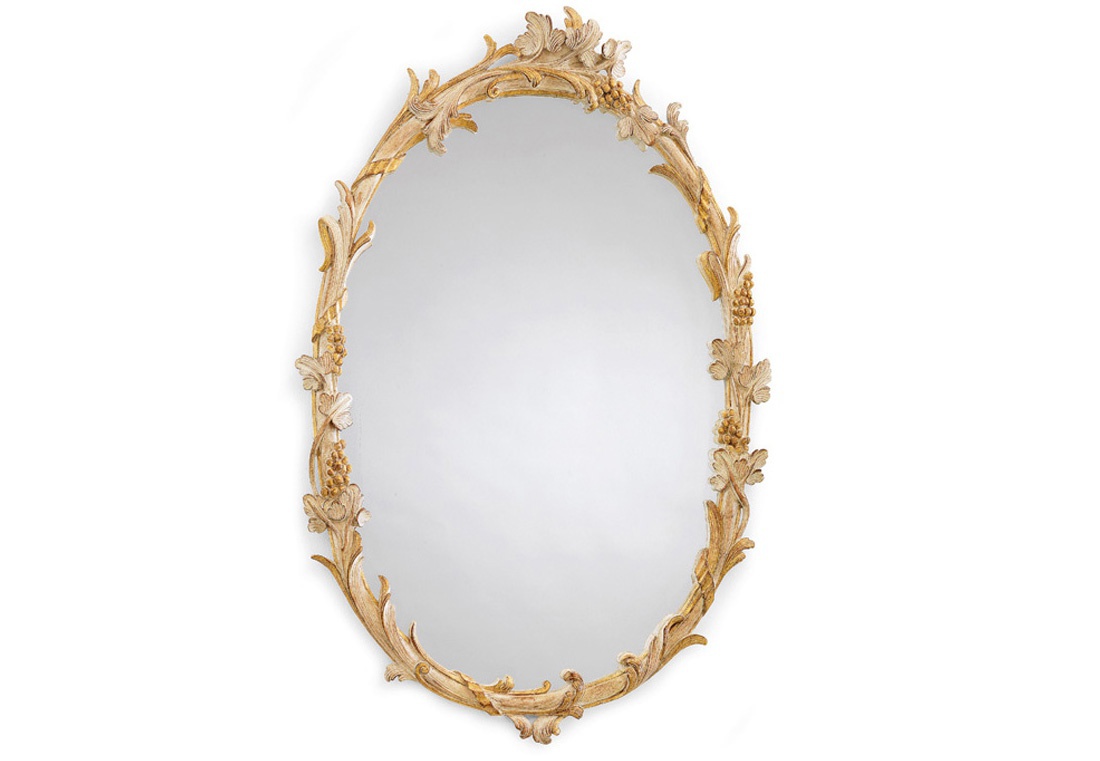 The mirror is from Italian producer Roberto Giovannini. The frame is made of wood. Finishing - gilding, patination and artificial aging. Colors to choose in stock. The mirror is oval in shape, with decoration in the form of twisted sheets that will perfectly fit to your living room or dining room, takes in the era of the late eighteenth century.
