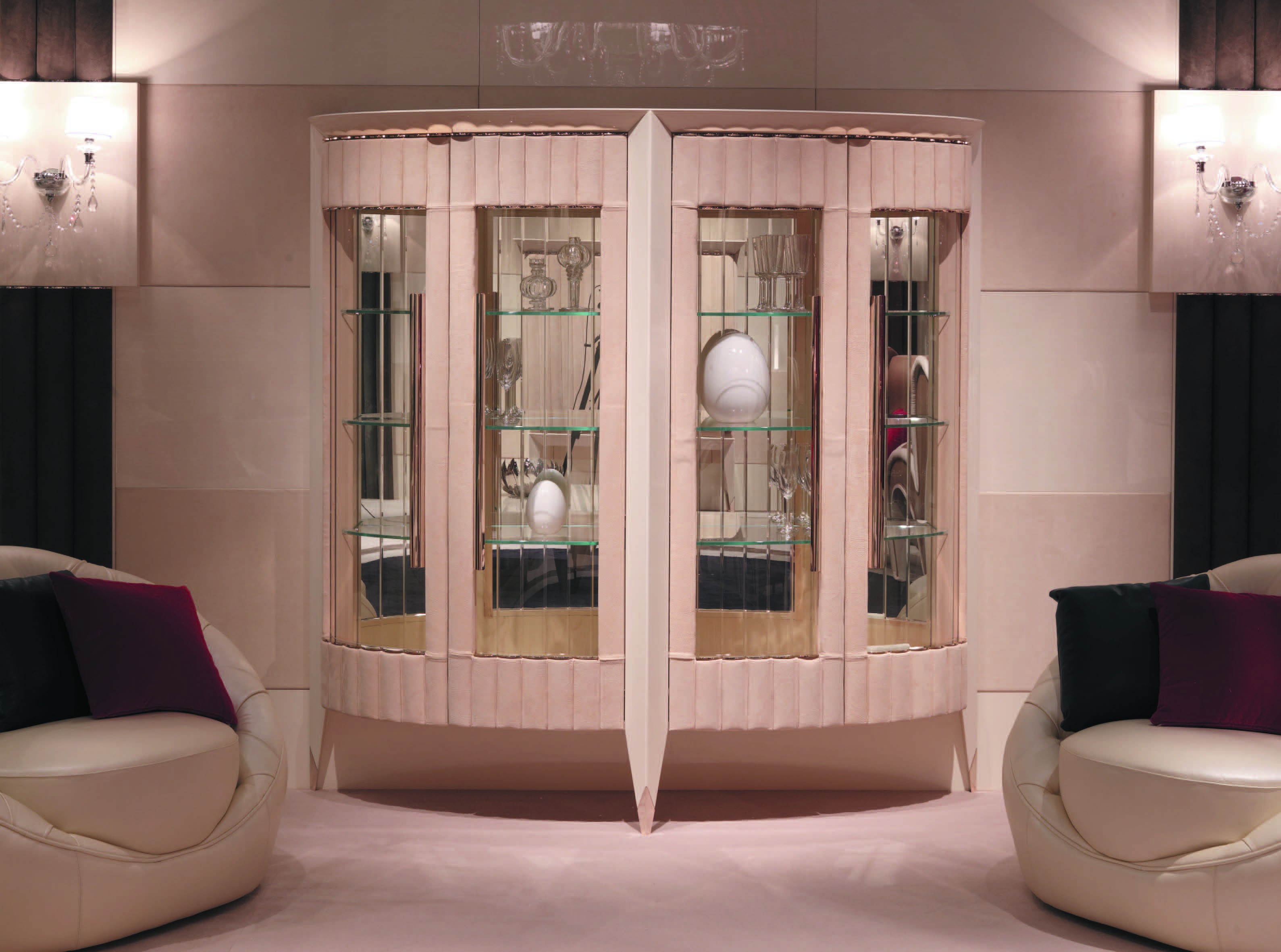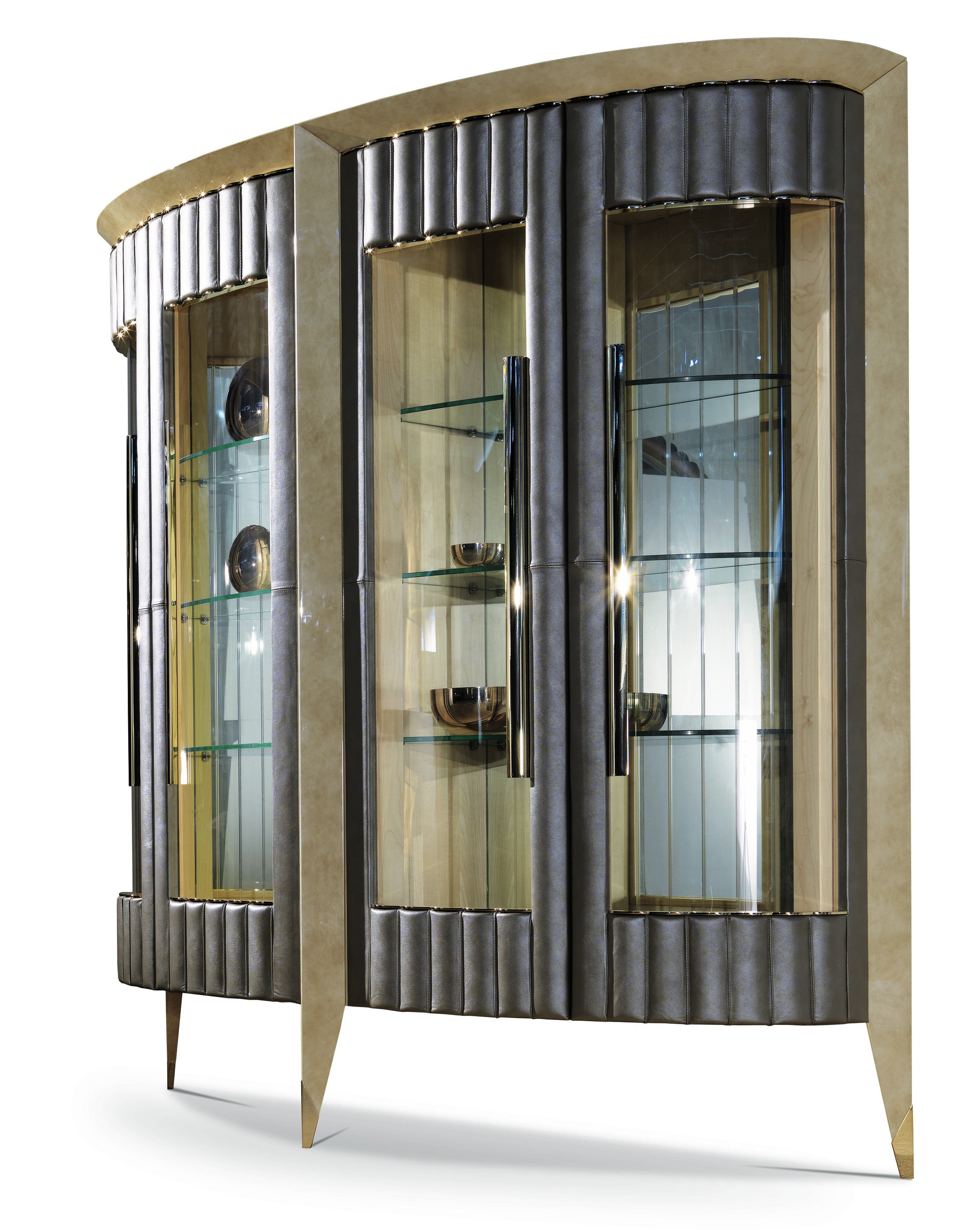 Showcase Orion from the Italian manufacturer Turri. Model with 4 doors. The frame is made of wood. Shutters, shelves - glass. Accessories metal chrome. Decor presents corrugated finish of the facade of a leather different textures, from the company portfolio. Colors - in stock.