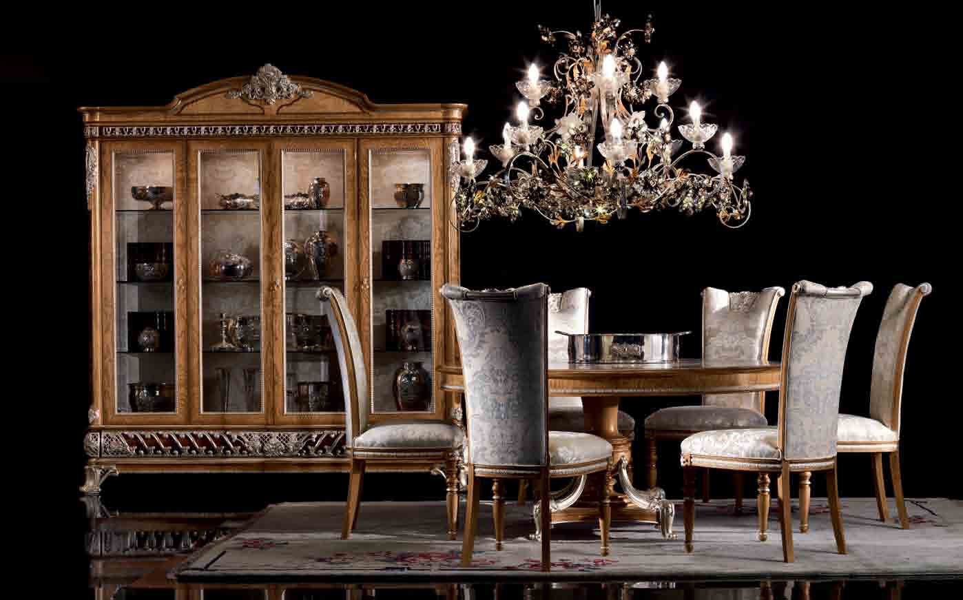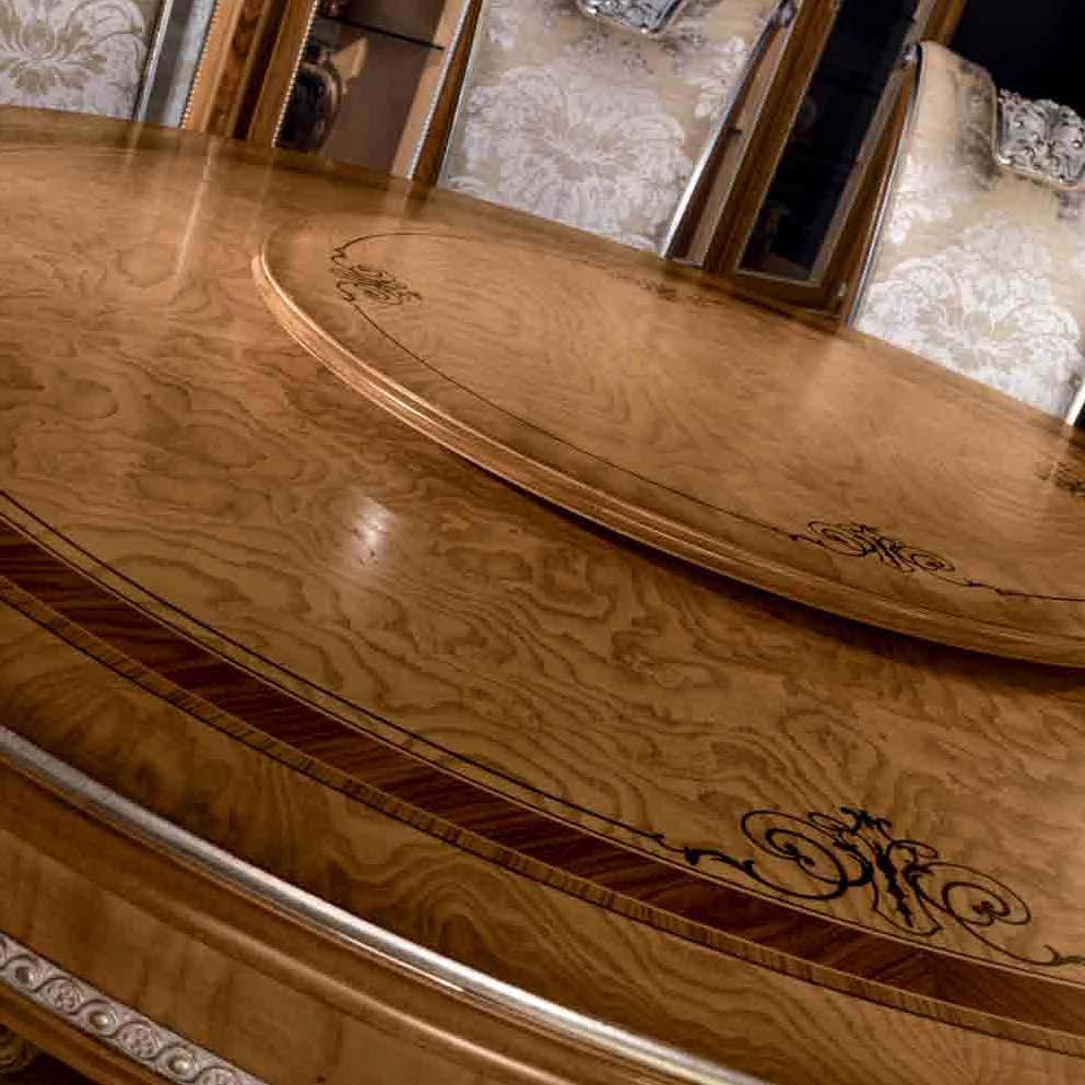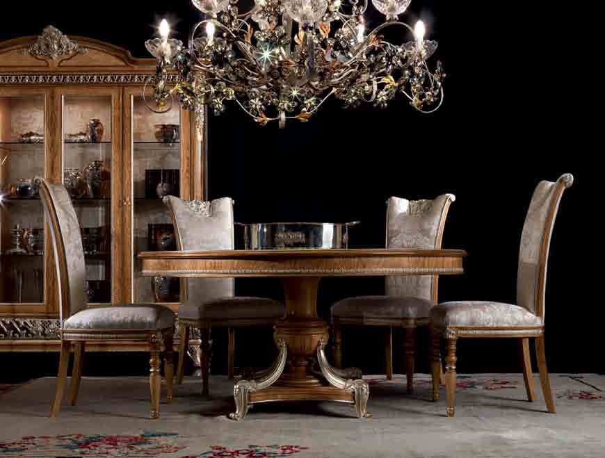Round dining table from the Italian manufacturer Jumbo Collection. Original model in a classical style, collection Opera. Frame made of natural wood of hard sorts, of particular importance is the use of high quality veneer dark or light shades. Decorative elements are carved, handmade. Varnishing is made with antique wax.
