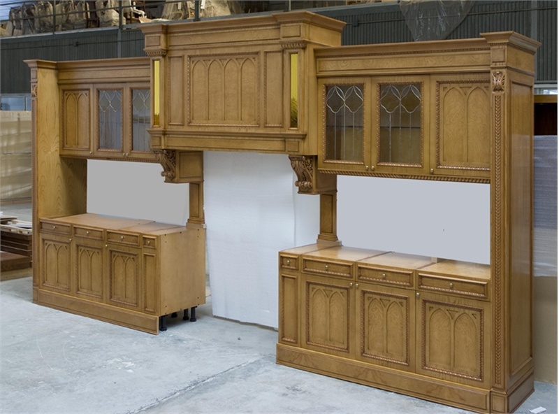 Kitchen Cocina from Spanish manufacturer Pico. Kitchen set in classical style. All modular elements are made manually. Transitions are carved pilasters, also with built-in storage system. It is proposed a variant in which the surface is entirely decorated in silver. Working surface made of marble, while the back panel has integrated backlighting. In the kit you can buy table with marble top. The model with two closed side partitions, drawers and glass inserts with decorative metal opaque glass underneath the stained glass. At the request of the customer can be supplemented with modules of other configurations, presented in the program. A feature of the collection is a rich carved d?cor.
