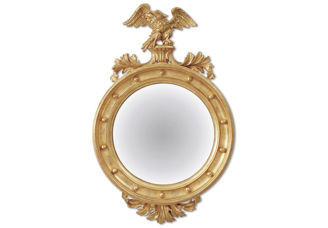 The mirror is from Italian producer Roberto Giovannini. Round mirror made of wood. Finish - gold leaf. Decorative elements in the form of an eagle on a pedestal is hand carved. Colors to choose in stock. The mirror designed in classic style. Gorgeous decoration for Your living room, combining tradition and design of the end of the XIII century.