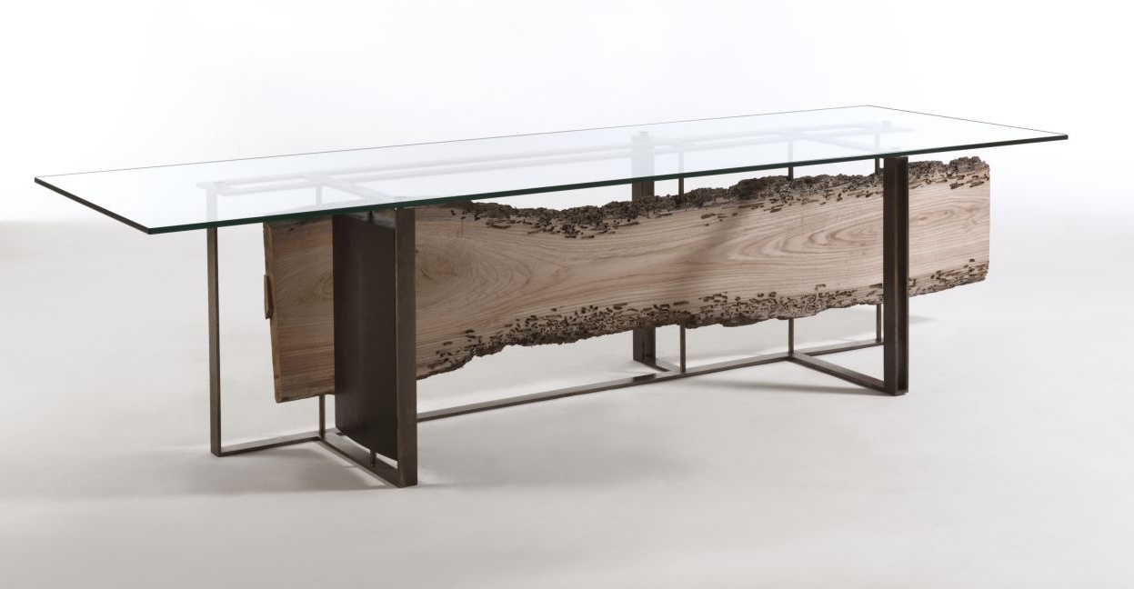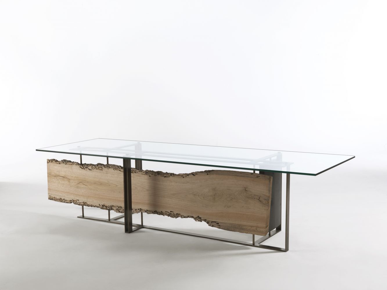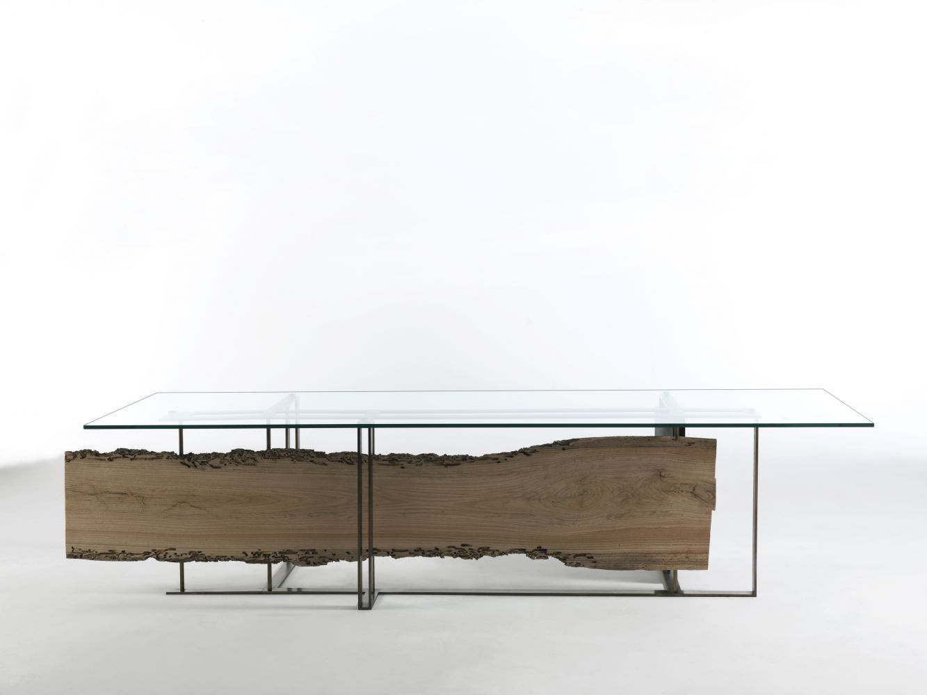 Table Cornice from the Italian manufacturer Riva 1920. The frame is made from metal and painted in bronze. Complements the design of the solid oak. Rectangular top is made of glass.