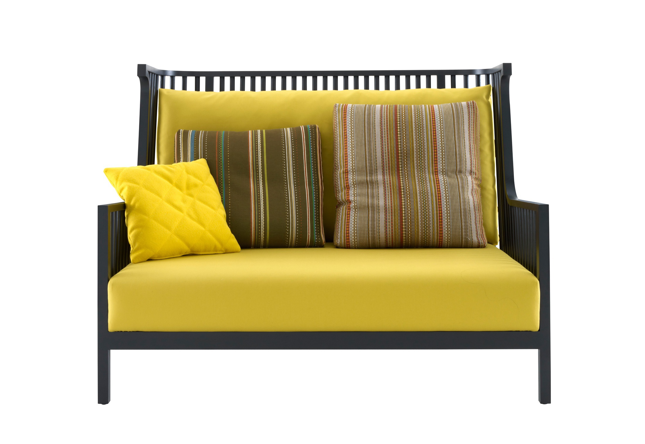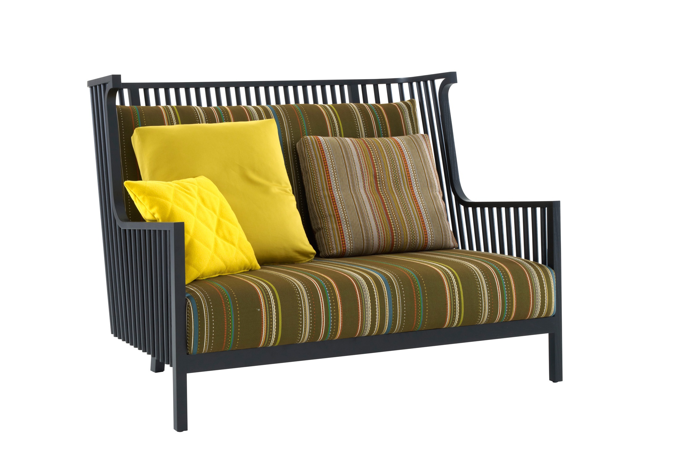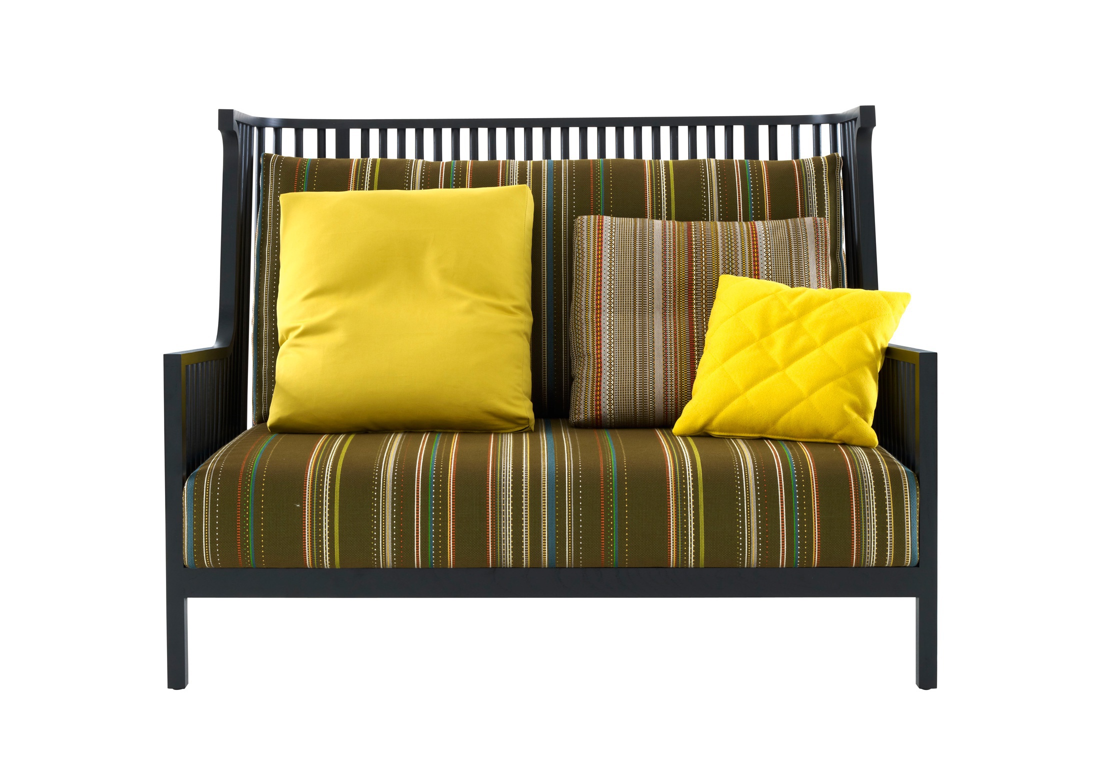 Double sofa ELIZABETH from French manufacturer Ligne Roset. Frame of solid beech, tinted in black. Seat cushion filled with polyurethane foam Bultex. Back cushions filled with feathers placed in the cells (10% down, 90% feathers young). The model is made in modern style. Colours in stock.