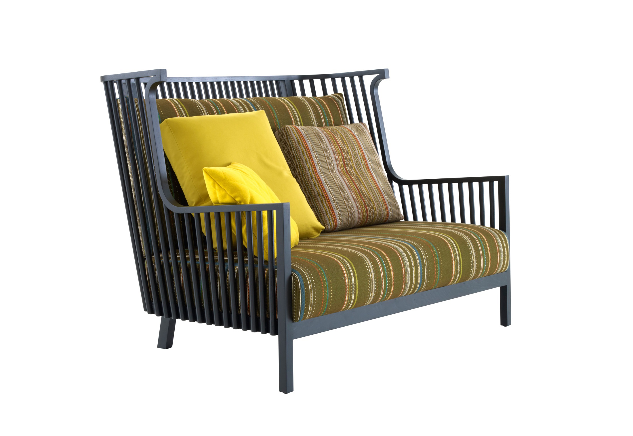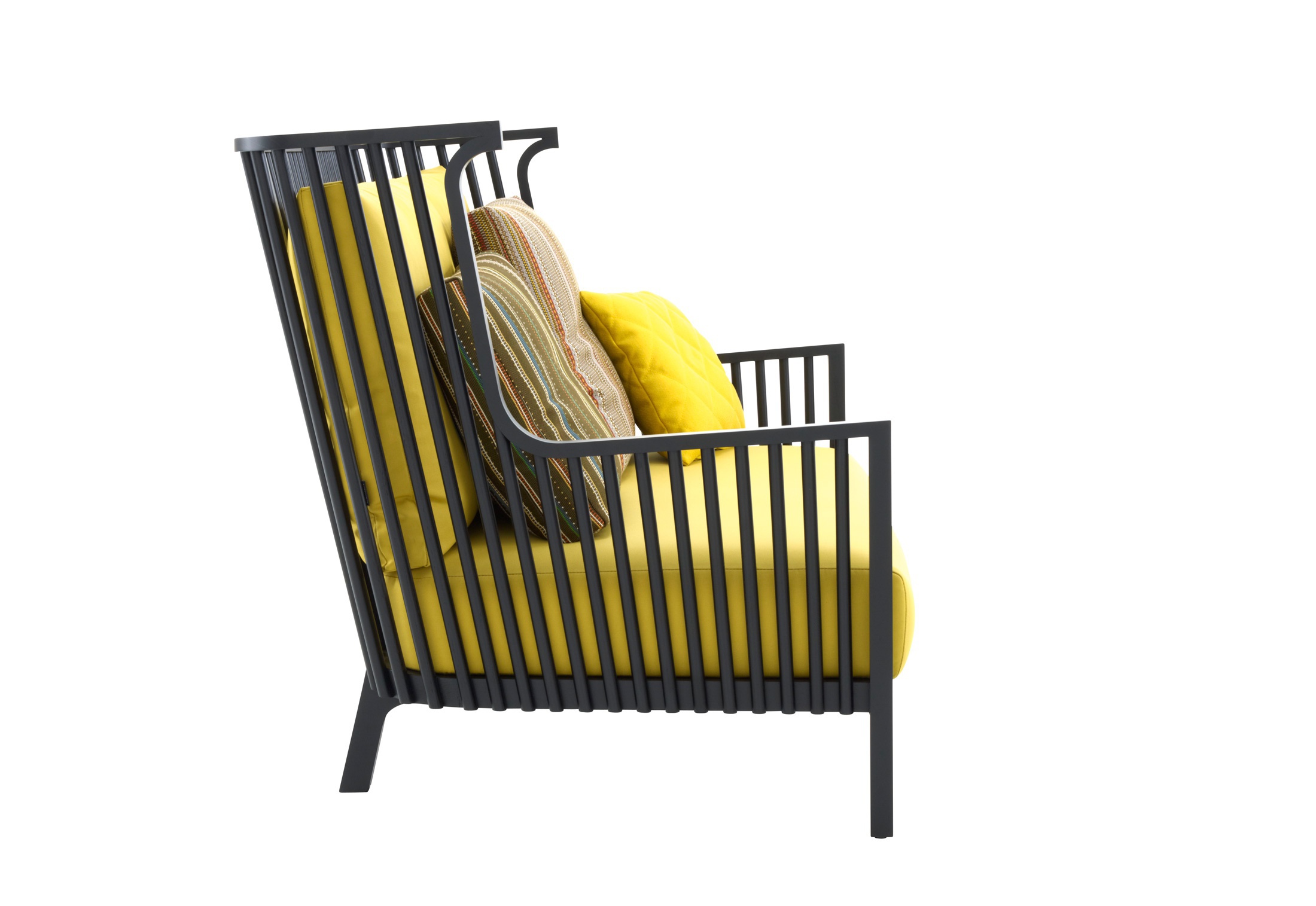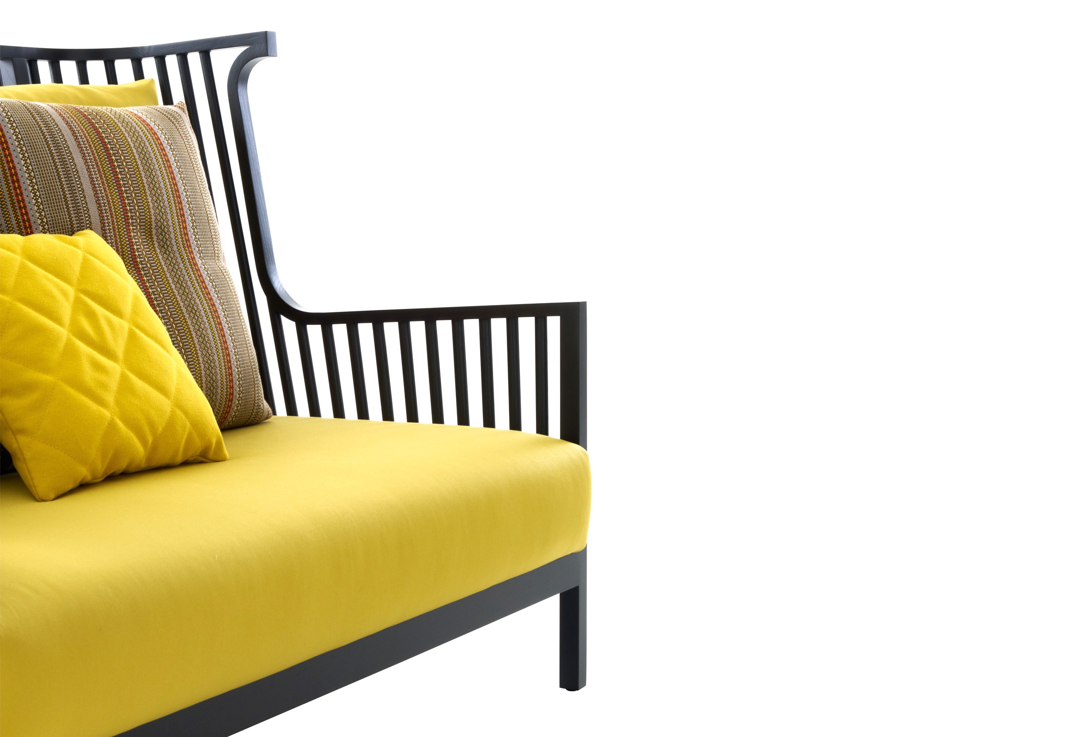 Double sofa ELIZABETH from French manufacturer Ligne Roset. Frame of solid beech, tinted in black. Seat cushion filled with polyurethane foam Bultex. Back cushions filled with feathers placed in the cells (10% down, 90% feathers young). The model is made in modern style. Colours in stock.