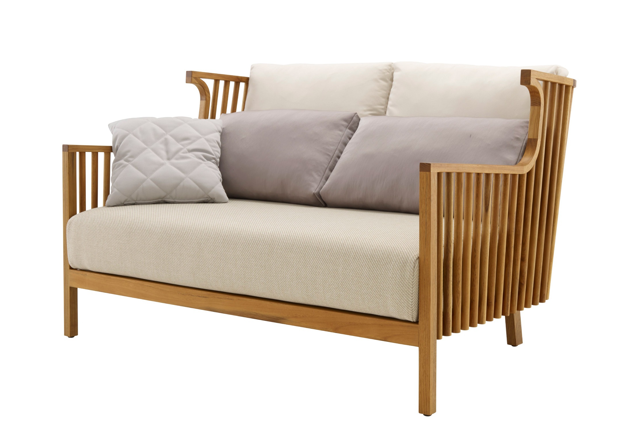 Double sofa ELIZABETH TECK from French manufacturer Ligne Roset. The frame of the sofa is lower and is made from solid teak, obtained from renewable forest areas in Indonesia. The cushion is provided with a waterproof coating, whereby the covers can be made of materials for use on the street and from the materials collection, intended for the room. The set of sofa includes seat cushion, back cushion, pillow under the lower back, as well as an additional pillow with decorative stitching. The model is made in modern style.