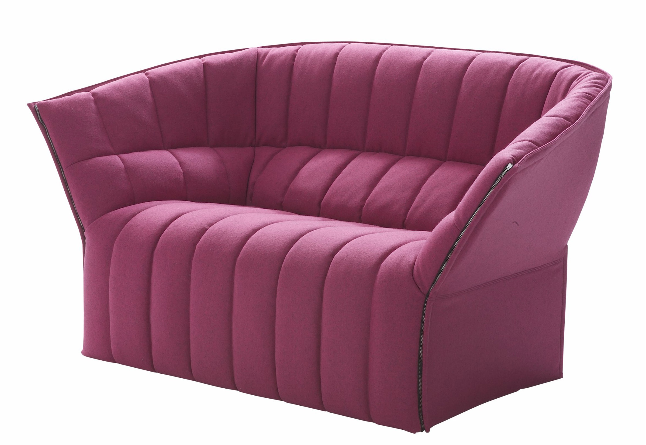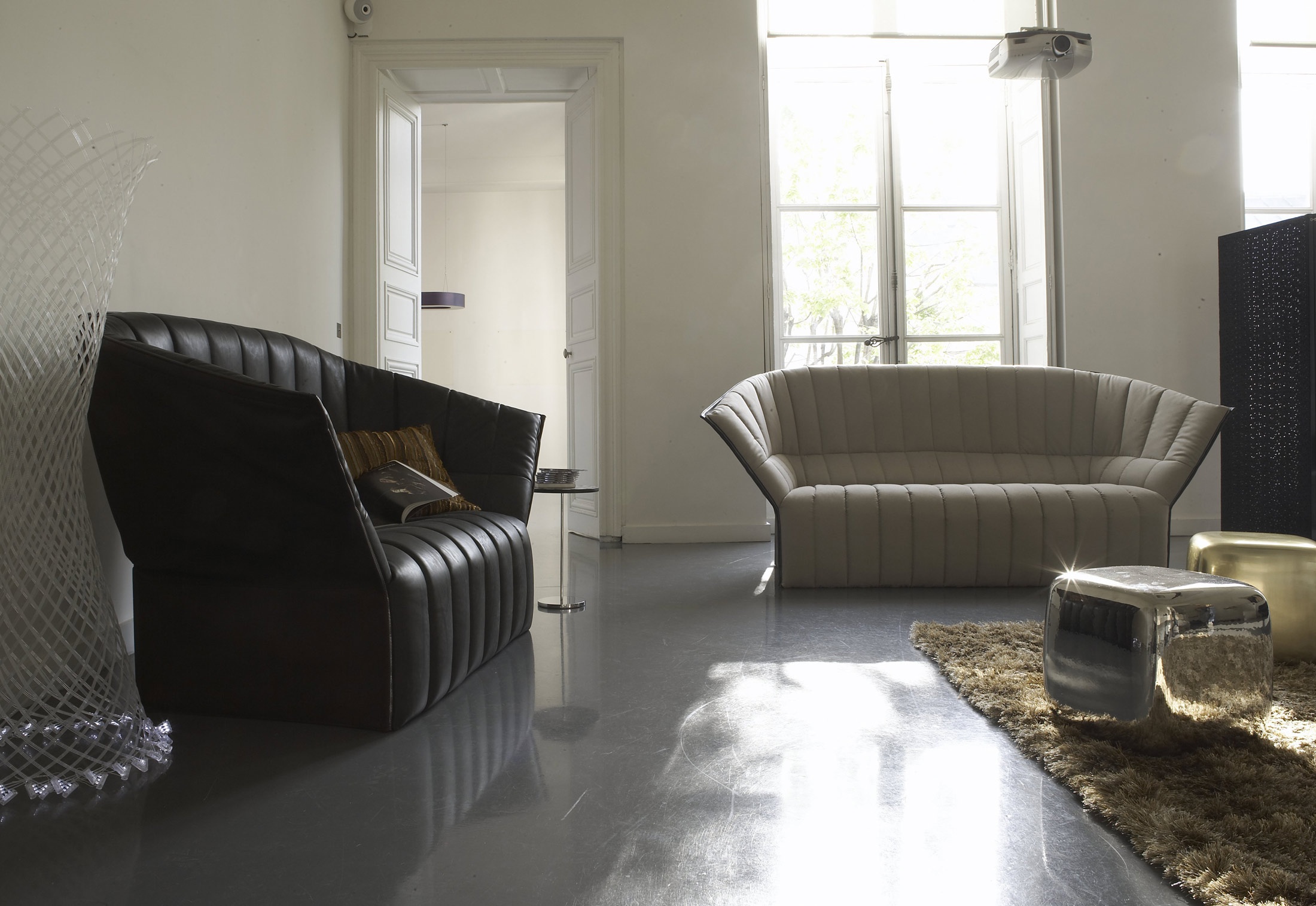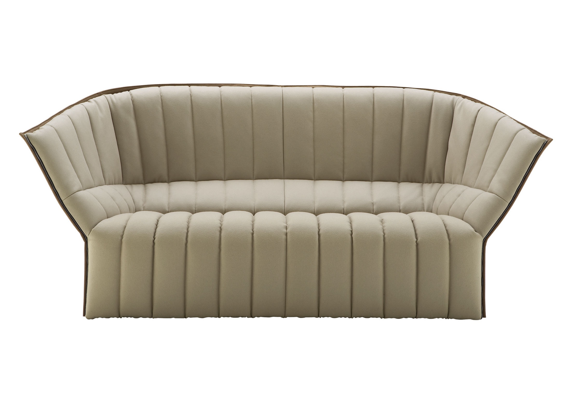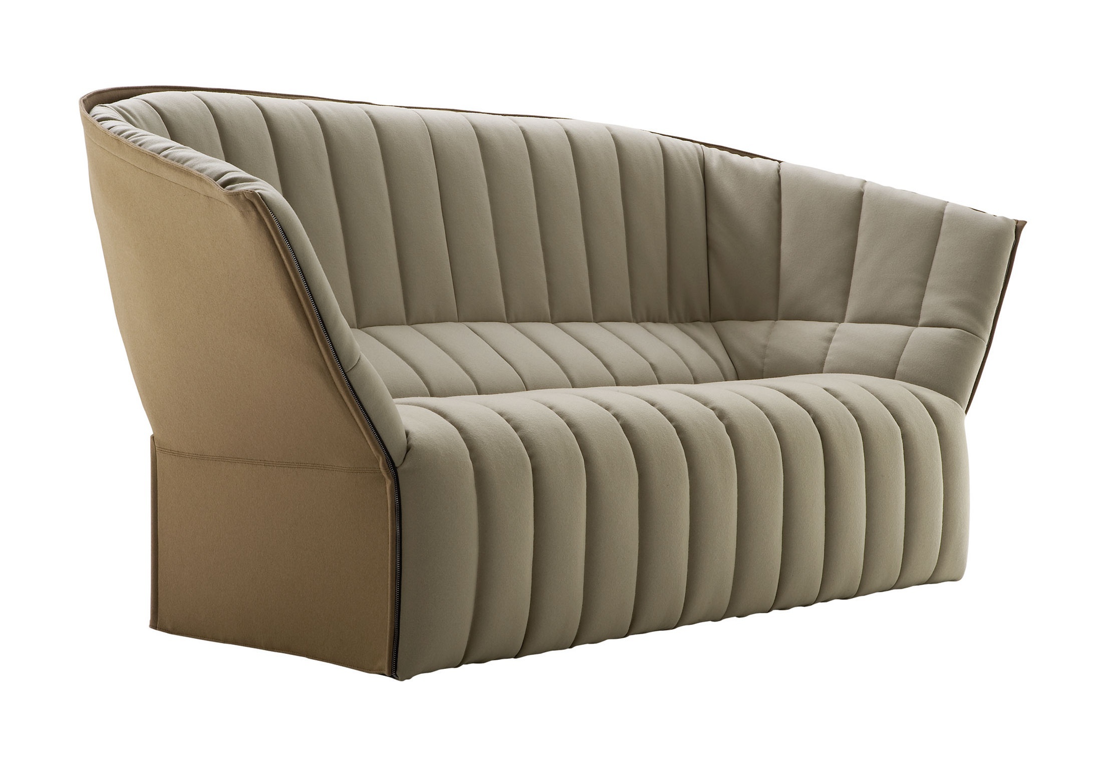Double sofa MOËL from French manufacturer Ligne Roset. The name comes from the French moelleux, which means "soft and soulful". Rounded, soft lines emphasize a comprehensive feeling of comfort: it would be pleasant to bask, rest my head and lean back and arms. In the chair and on the sofa MOËL with a huge soft cushion feels like a nest or cocoon, which provides safe shelter, radiates calm and confidence. Noteworthy quilted backrest upholstered in leather or shorn wool. The model is made in modern style. Colours in stock.