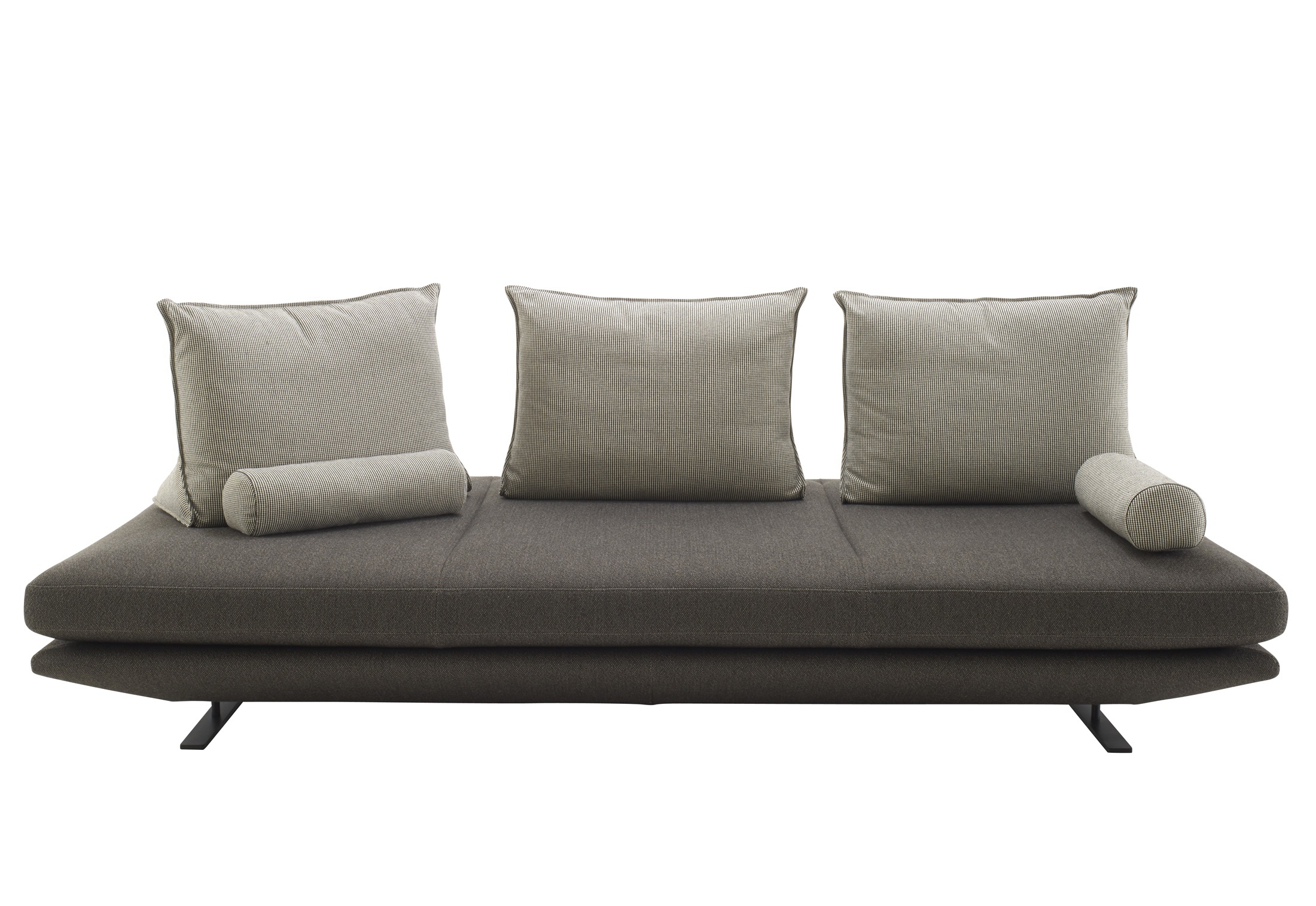 Three seater sofa PRADO from French manufacturer Ligne Roset. Triple sofa with three backs and two beads. Made to order is available rectangular pillow-armrest and stretch the case a width of 100 or 120 cm to use the sofa as a bed. Seat covers, backrests, cushions and armrests can be easily combined. Legs - metal. The model is made in modern style. Colours in stock.