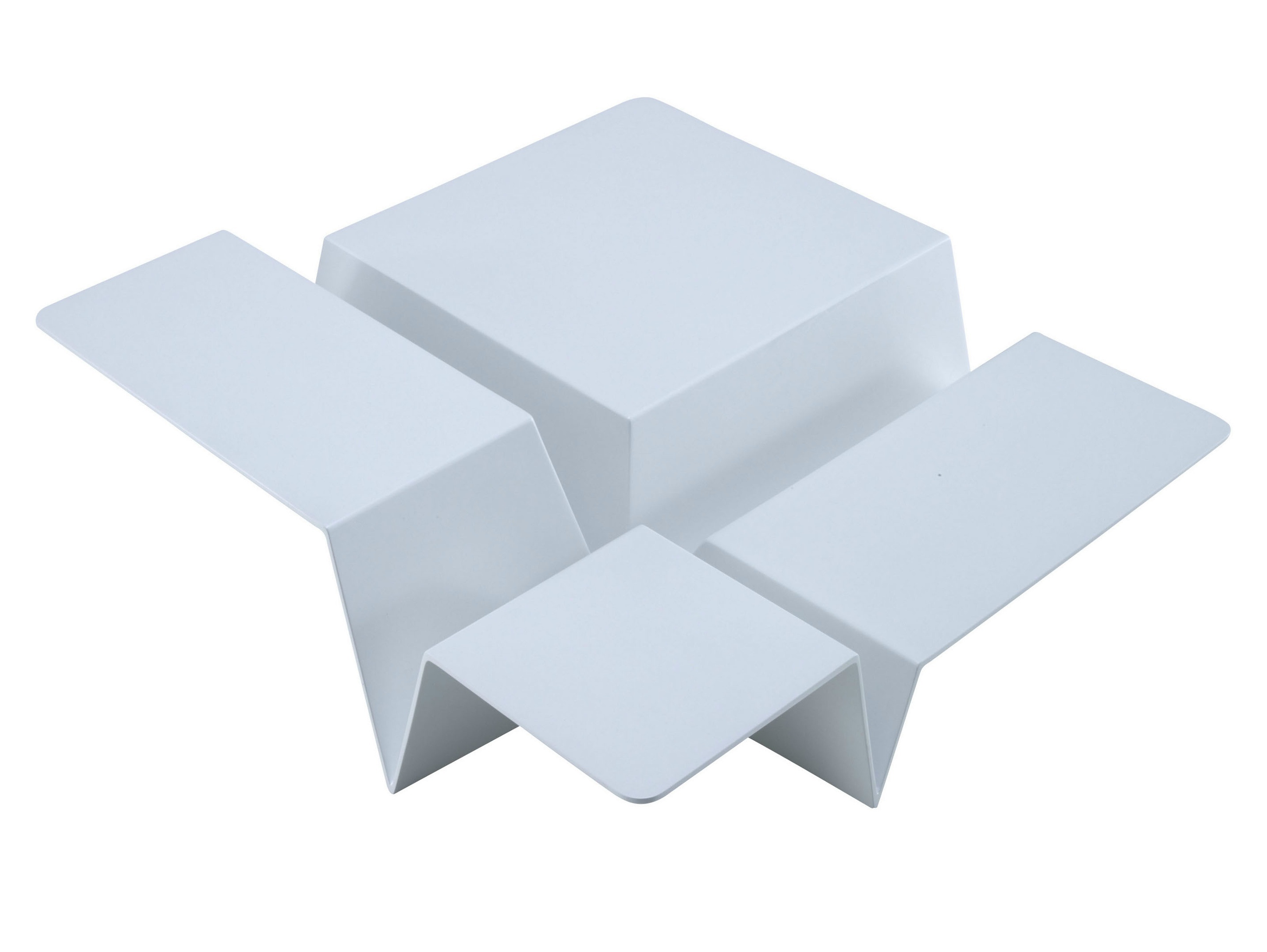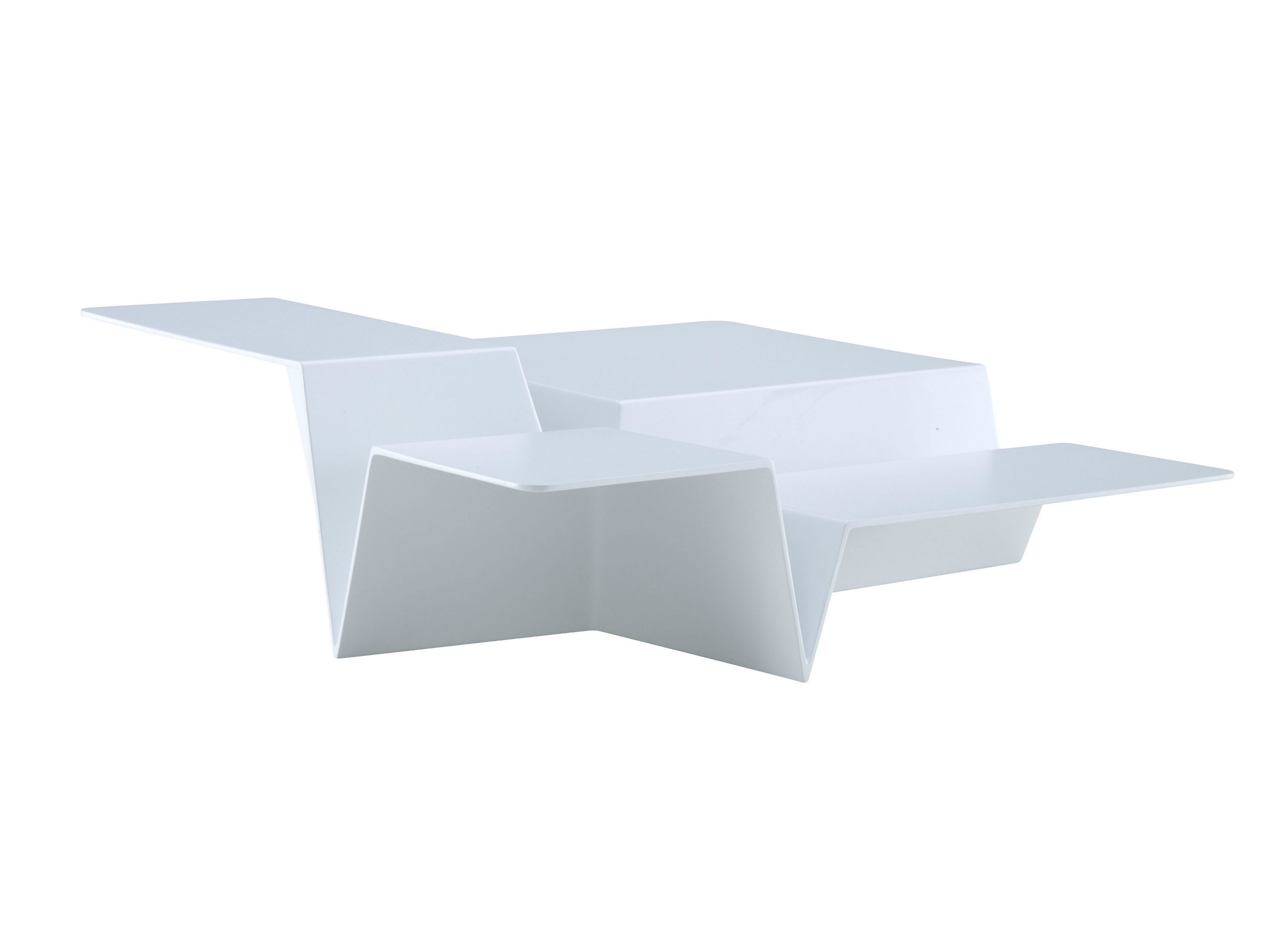Coffee table CUTS from French manufacturer Ligne Roset. The table top has two perpendicular slots, forming at the apex an angle of 28°. Thus, there are four different countertops located at three different heights. The irregular shape of the table top contrasts with the small thickness, 8 mm, the only material used, and monochrome white. The dimensions of the parts of the table top convenient for a variety of purposes, the slot can be used as supports for logs. When viewed from the side, the table CUTS have different contours, but in any case they remain light as a paper airplane.