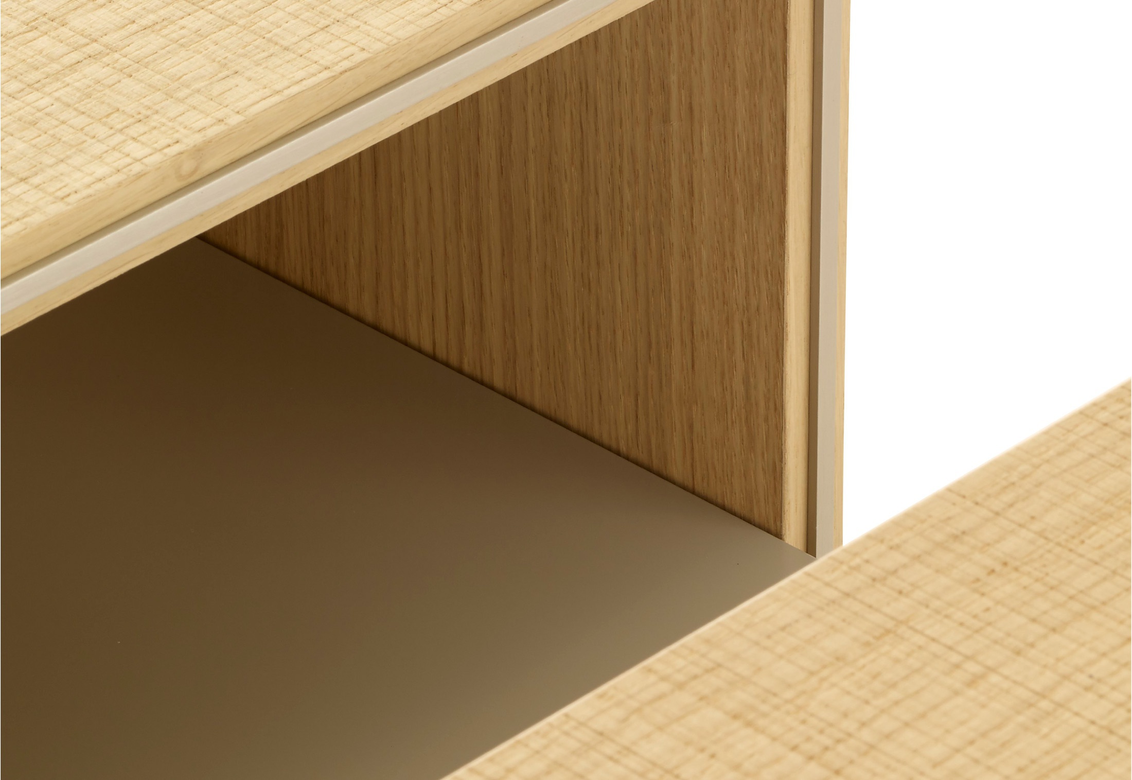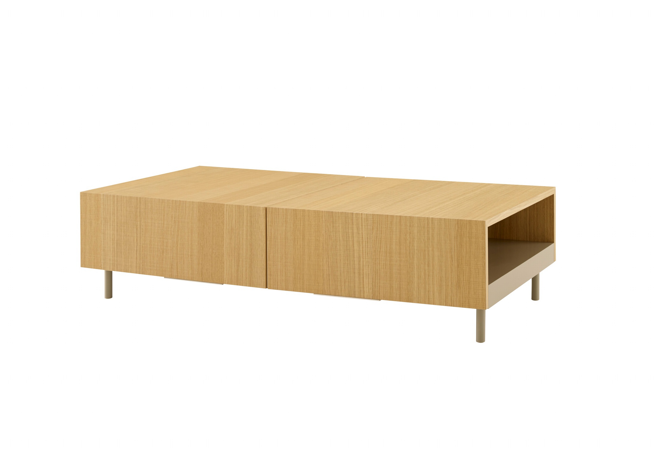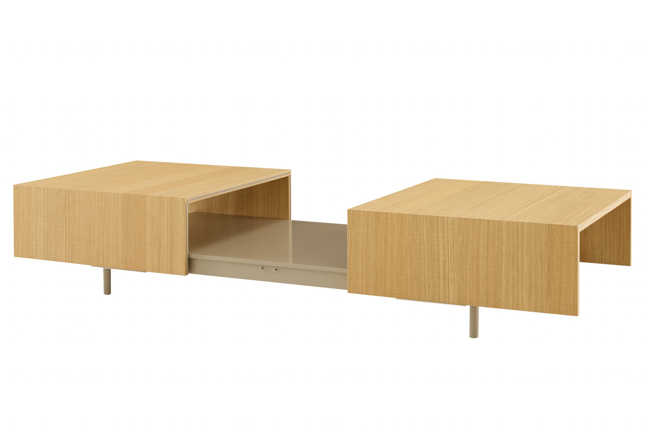 Coffee table DUALIST from French manufacturer Ligne Roset . After unusual vases and EGO UPSIDE-DOWN, the company Ligne Roset launches in 2014 its new project DUALIST - functional coffee and side tables with storage space. Coffee tables consist of a tabletop and two volume elements moving by runners. The upper part is ash wood, natural or tinted in anthracite, the base and legs are clay-gray lacquer.